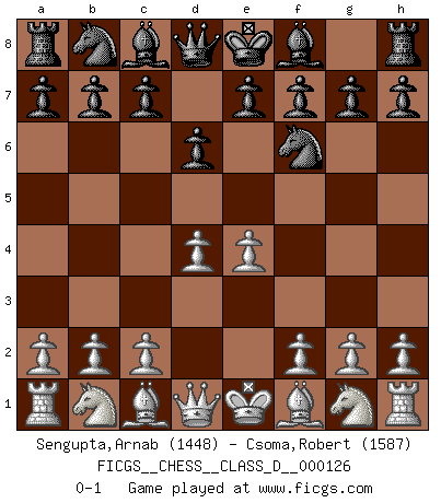 Last move : 0-1 2009 September 6 10:16:4 [Event "FICGS__CHESS__CLASS_D__000126"] [Site "FICGS"] [Date "2009.07.13"] [Round "1"] [White "Sengupta,Arnab"] [Black "Csoma,Robert"] [Result "0-1"] [WhiteElo "1448"] [BlackElo "1587"] 1.e4 d6 2.d4 Nf6 0-1 This chess game has been lost on time (started : 2009.07.13 7:13:38) King's pawn Opening Player Black won this chess game. Follow this game move after move (download)Fischer is the strongest player in the world. In fact, the strongest player who ever lived. (Larry Evans) Im Schach nämlich geht es darum, daß Ich des Gegners klein zu kriegen, sein Ego zu zerbrechen und zu zermahlen, seine Selbstachtung zu zertreten und zu verscharren und seine ganze mißachtenswerte sogenannte Persönlichkeit ein für alle Mal tot zu hacken und zu zerstampfen und dadurch die menschliche Gesellschaft von einer stinkenden Pestbeule zu befreien. Es ist ein königliches Spiel. (Robert James Fischer) Siempre es mucho mejor sacrificar las piezas de tu oponente. (Savielly Tartakover) Vouloir jouer aux échecs contre soi-même est aussi paradoxal que vouloir marcher sur son ombre. (Stefan Zweig) In fact if nothing is done against this teddy bear, hereby I announce that I would quit chess, rapid chess, blitz chess, postal chess, email chess, server chess and correspondence chess I will then switch to a table game where teddy bears aren't going to be seen for a while, like Poker, or Roulette, all 18+ games. (Elmer Valderrama)