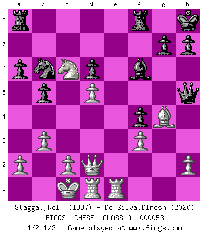 Last move : 1/2-1/2 2010 March 31 14:6:49 [Event "FICGS__CHESS__CLASS_A__000053"] [Site "FICGS"] [Date "2009.07.13"] [Round "1"] [White "Staggat,Rolf"] [Black "De Silva,Dinesh"] [Result "1/2-1/2"] [WhiteElo "1987"] [BlackElo "2020"] 1.e4 c5 2.Nf3 d6 3.d4 cxd4 4.Nxd4 Nf6 5.Nc3 a6 6.Be3 e5 7.Nb3 Be6 8.Qd2 Nbd7 9.f3 Be7 10.g4 O-O 11.O-O-O b5 12.g5 Nh5 13.Nd5 Bxd5 14.exd5 f5 15.gxf6 Bxf6 16.Na5 Qe8 17.Bh3 Nf4 18.Bxf4 exf4 19.Kb1 Nb6 20.Rhe1 Qg6 21.b3 Rab8 22.Be6+ Kh8 23.Kc1 Qh5 24.Nc6 Ra8 25.Bg4 1/2-1/2 Sicilian : Najdorf, Byrne (English) attack Kingside Castling by player Black (move 10) Queenside Castling by player White (move 11) This chess game ended in a draw. Follow this game move after move (download)I am still a victim of Chess. It has all the beauty of art and much more. It cannot be commercialized. Chess is much purer than art in its social position. (Marcel Duchamp) Smyslow ist ein Beweis dafür, dass ich noch zehn Jahre spielen kann! [der 75 jährige über den 85 jährigen] (Viktor Kortschnoi) El juego de Fischer siempre fue nítido, racional y brillante. Uno de los mejores por siempre. (Dave Regis) Shah mat. Le roi est mort. Cri de fierté d'un joueur venant de terrasser son adversaire, courtoisement, sans effusion de sang. There will be no order, only chaos. (Sol Robeson in Pi by Darren Aronofsky)