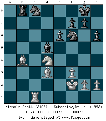Last move : 1-0 2009 November 27 20:52:15 [Event "FICGS__CHESS__CLASS_A__000053"] [Site "FICGS"] [Date "2009.07.13"] [Round "1"] [White "Nichols,Scott"] [Black "Suhodolov,Dmitry"] [Result "1-0"] [WhiteElo "2103"] [BlackElo "1993"] 1.c4 Nf6 2.Nc3 e6 3.d4 Bb4 4.e3 O-O 5.Bd3 d5 6.Nf3 c5 7.O-O dxc4 8.Bxc4 cxd4 9.exd4 b6 10.Qb3 Bxc3 11.bxc3 Bb7 12.Ba3 Re8 13.Bb5 Nbd7 14.Nd2 a6 15.Be2 b5 16.c4 Nb6 17.cxb5 Qxd4 18.Nf3 Qe4 19.Rfe1 Bd5 20.Qb4 Qxb4 21.Bxb4 axb5 22.Bxb5 Reb8 23.Bd6 Rb7 24.a4 Nxa4 25.Nd4 Ne4 26.Bb4 R7b8 27.Rec1 Nb6 28.f3 Rxa1 29.Rxa1 Nf6 30.Kf2 Nc8 31.Rc1 h6 32.Bd3 1-0 English Opening Kingside Castling by player Black (move 4) Kingside Castling by player White (move 7) Player White won this chess game. Follow this game move after move (download)I am the best player in the world and I am here to prove it. (Bobby Fischer) Ich habe Kasparov in Rente geschickt. (Veselin Topalov) El Jaque al descubierto es el bombardero del tablero. (Reuben Fine) Aidez vos pièces, elles vous aideront. (Paul Morphy) There are two kinds of tragedy in this world, one is not getting what you want and the other is getting. (Lord of war)