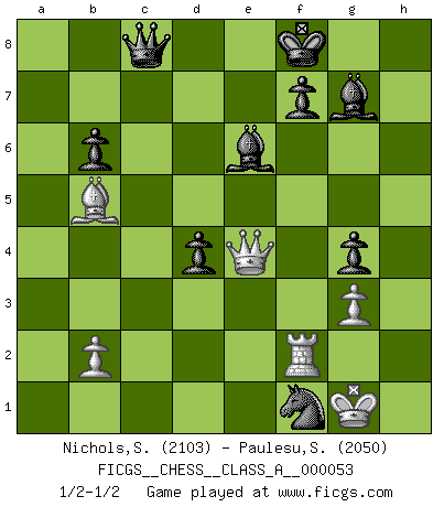 Last move : 1/2-1/2 2009 October 31 14:48:57 [Event "FICGS__CHESS__CLASS_A__000053"] [Site "FICGS"] [Date "2009.07.13"] [Round "1"] [White "Nichols,Scott"] [Black "Paulesu,Sebastiano"] [Result "1/2-1/2"] [WhiteElo "2103"] [BlackElo "2050"] 1.c4 Nf6 2.Nc3 e5 3.a3 Nc6 4.Nf3 g6 5.d3 Bg7 6.Bg5 h6 7.Bxf6 Bxf6 8.h4 O-O 9.h5 g5 10.g3 d6 11.Nd2 Bg7 12.Bg2 Ne7 13.e3 c6 14.Qe2 d5 15.cxd5 cxd5 16.Nb3 d4 17.exd4 exd4 18.Ne4 Nd5 19.O-O b6 20.Rfe1 Re8 21.Nbd2 Kf8 22.Qf1 Bf5 23.Nc4 Re6 24.Rac1 Rc8 25.a4 Rec6 26.Qe2 Be6 27.Ned2 g4 28.Qd1 Qg5 29.Qb3 Qxh5 30.a5 Kg8 31.axb6 axb6 32.Ra1 Qg5 33.Qb5 h5 34.Re2 Qd8 35.Nb3 h4 36.Ra7 hxg3 37.fxg3 Rxc4 38.dxc4 Ne3 39.Qh5 Bxc4 40.Rf2 Qe8 41.Nd2 Rc5 42.Qh1 Be6 43.Be4 Rc1+ 44.Nf1 Kf8 45.Ra8 Rc8 46.Bc6 Qe7 47.Bb5 Qd8 48.Rxc8 Qxc8 49.Qe4 Nxf1 1/2-1/2 English Opening Kingside Castling by player Black (move 8) Kingside Castling by player White (move 19) This chess game ended in a draw. Follow this game move after move (download)A thorough understanding of the typical mating continuations makes the most complicated sacrificial combinations leading up to them not only not difficult, but almost a matter of course. (Siegbert Tarrasch) Bogoljubow: Matt in vier Zügen! Tartakower: Ich verbitte mir jede Belästigung! (Savielly Grigorievitsch Tartakower) Un jugador que trata de regresar una movida en el Ajedrez es un futuro carterista. (Richard Fenton) On peut tirer plus d'utilité d'une partie perdue que de 100 parties gagnées. (Capablanca) Establishing goals is all right if you don't let them deprive you of interesting detours. (Doug Larson)