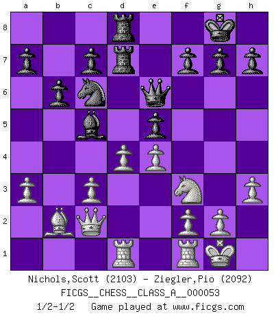 Last move : 1/2-1/2 2009 July 23 14:2:59 [Event "FICGS__CHESS__CLASS_A__000053"] [Site "FICGS"] [Date "2009.07.13"] [Round "1"] [White "Nichols,Scott"] [Black "Ziegler,Pio"] [Result "1/2-1/2"] [WhiteElo "2103"] [BlackElo "2092"] 1.c4 Nf6 2.Nc3 e5 3.a3 d5 4.cxd5 Nxd5 5.e4 Nxc3 6.bxc3 Bc5 7.Nf3 O-O 8.Bc4 Nc6 9.h3 Qd6 10.d3 Be6 11.Bxe6 Qxe6 12.O-O Rad8 13.Qc2 b6 14.Bb2 Rd7 15.Rad1 Rfd8 16.d4 1/2-1/2 English Opening Kingside Castling by player Black (move 7) Kingside Castling by player White (move 12) This chess game ended in a draw. Follow this game move after move (download)If a ruler does not understand Chess, how can he rule over a kingdom ? (King Khusros II) Wer mein Gambit spielt, muß bereit sein, alle Brücken hinter sich abzubrechen. Es verändert den ganzen Menschen. Es wirkt wie ein Zauberstab und fördert verkümmerte, gute Charakter- eigenschaften wieder zu Tage. (Emil Joseph Diemer) Nunca antes ha habido un jugador de Ajedrez con tal conocimiento a fondo de las complejidades del juego y una inmensa voluntad absolutamente indomable de ganar. Yo pienso que Fischer es el jugador mas grande que jamás haya existido. (Lisa Lane) Des points faibles ou des trous dans la position de l'adversaire doivent être occupés par des pièces et non pas par des pions. (Siegbert Tarrasch) Memory is a complicated thing, a relative to truth, but not its twin. (Barbara Kingsolver, Animal Dreams)