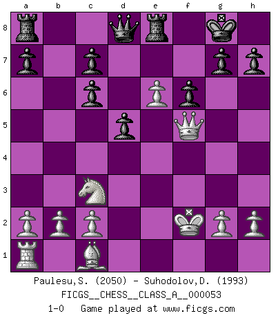 Last move : 1-0 2009 November 23 8:43:13 [Event "FICGS__CHESS__CLASS_A__000053"] [Site "FICGS"] [Date "2009.07.13"] [Round "1"] [White "Paulesu,Sebastiano"] [Black "Suhodolov,Dmitry"] [Result "1-0"] [WhiteElo "2050"] [BlackElo "1993"] 1.e4 e5 2.d4 exd4 3.Bc4 Nf6 4.Nf3 Nc6 5.e5 d5 6.Bb5 Ne4 7.O-O Bg4 8.Qxd4 Bc5 9.Qd3 O-O 10.Bxc6 bxc6 11.Nc3 Nxf2 12.Rxf2 Bxf2+ 13.Kxf2 Bxf3 14.Qxf3 f6 15.e6 Re8 16.Qf5 1-0 This chess game has been lost on time (started : 2009.07.13 16:56:6) Centre game Kingside Castling by player White (move 7) Kingside Castling by player Black (move 9) Player White won this chess game. Follow this game move after move (download)Chess, like love, like music, has the power to make people happy. (Siegbert Tarrasch) Ich kenne Menschen, die allen Willen der Welt besitzen und doch nicht Schach spielen können. (Robert James Fischer) Aún deseo matar a Fischer. (Boris Spassky) Karpov est une pièce de musée. (Garry Kasparov) The Movers & Shakers of this world are those who play chess in the mornings and go to the disco in the evenings. (Dinesh De Silva)