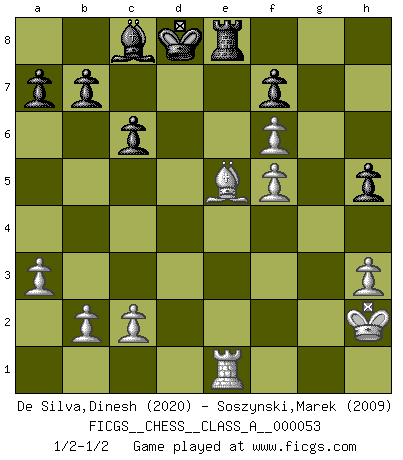 Last move : 1/2-1/2 2009 November 23 1:56:19 [Event "FICGS__CHESS__CLASS_A__000053"] [Site "FICGS"] [Date "2009.07.13"] [Round "1"] [White "De Silva,Dinesh"] [Black "Soszynski,Marek"] [Result "1/2-1/2"] [WhiteElo "2020"] [BlackElo "2009"] 1.e4 e5 2.Nf3 Nc6 3.Bb5 Nf6 4.O-O Nxe4 5.d4 Nd6 6.Bxc6 dxc6 7.dxe5 Nf5 8.Qxd8+ Kxd8 9.Nc3 Ne7 10.h3 h6 11.Be3 Ke8 12.Rad1 Bd7 13.a3 Nf5 14.Bf4 Be7 15.g4 Nh4 16.Nxh4 Bxh4 17.Kg2 Rd8 18.Bg3 Be7 19.f4 g6 20.f5 gxf5 21.gxf5 Bc8 22.Rxd8+ Bxd8 23.Ne4 Rg8 24.Kh2 h5 25.Nf6+ Bxf6 26.exf6 Kd8 27.Re1 Re8 28.Bxc7+ Kd7 29.Be5 Kd8 30.Bc7+ Kd7 31.Be5 Kd8 1/2-1/2 Ruy Lopez : Berlin defense, Open variation Kingside Castling by player White (move 4) This chess game ended in a draw. Follow this game move after move (download)When you absolutely don't know what to do anymore, it is time to panic. (John van der Wiel) Der Freibauer hat für mich eine Seele, genau wie der Mensch, Wünsche, die unerkannt in ihm schlummern, und Befürchtungen, von deren Existenz er selbst kaum ahnt. (Aaron Nimzowitsch) Hay dos clases de hombres: aquellos que se conforman en dejarse llevar por las circunstancias y que juegan barajas y aquellos decididos a controlar las circunstancias y que juegan al Ajedrez. (Mortimer Collins) Un footballeur joue avec ses pieds, parfois avec sa tête. Un joueur d'échecs ne joue qu'avec sa tête. Et quand il ne joue plus, il meurt. (Jacob Murray) The intuitive mind is a sacred gift; the rational mind is a faithful servant. We have created a society that honors the servant but has forgotten the gift. (Albert Einstein)