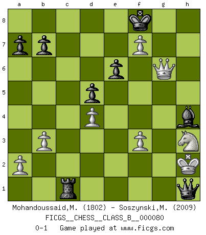 Last move : 0-1 2009 November 29 18:20:6 [Event "FICGS__CHESS__CLASS_B__000080"] [Site "FICGS"] [Date "2009.07.13"] [Round "1"] [White "Mohandoussaid,Malik"] [Black "Soszynski,Marek"] [Result "0-1"] [WhiteElo "1802"] [BlackElo "2009"] 1.d4 d5 2.Nf3 Nf6 3.Bf4 c5 4.e3 Nc6 5.Be2 Qb6 6.b3 Bf5 7.Bd3 Bxd3 8.Qxd3 Nh5 9.Bg3 e6 10.O-O Be7 11.c3 Nxg3 12.hxg3 O-O 13.Nbd2 Rac8 14.Rac1 Rc7 15.Rc2 cxd4 16.exd4 Rfc8 17.Rfc1 Ba3 18.Re1 Nb4 19.cxb4 Rxc2 20.Ng5 g6 21.Ndf3 R8c3 22.Qd1 Qxb4 23.Kh2 Rxf2 24.Nh3 R2xf3 25.gxf3 Rc1 26.Qd3 Qxe1 27.g4 h5 28.gxh5 Be7 29.hxg6 Bh4 30.gxf7+ Kf8 31.Qg6 Qh1+ 0-1 Queen's Bishop game Kingside Castling by player White (move 10) Kingside Castling by player Black (move 12) Player Black won this chess game. Follow this game move after move (download)Tactics flow from a superior position. (Bobby Fischer) Ich kenne keine einzige Person, die behaupten würde, Garri Kasparow sei ein guter Mensch (Nigel Short) El Ajedrez es en su esencia, un juego. En su forma, un arte. Y en su ejecución, una ciencia. (Baron Tassilo) Botvinnik disait en comparant les échecs à la musique: Il existe une science dont le but est l'étude de l'acoustique et des sons. Mais il y a aussi un art qui se sert de l'océan des sons : c'est la musique. De toute évidence, il en est de même pour la pensée. La logique est l'étude des lois de la réflexion et les échecs reflètent, en tant qu'art, le côté logique de la réflexion, sous la forme d'images artistiques... Extrait de Fischer - Spassky, Reykjavik 1972 par Alexander & F. Wyndham (Ed. Solar), p 37. Programmer - an organism that turns coffee into software. (Anonymous)