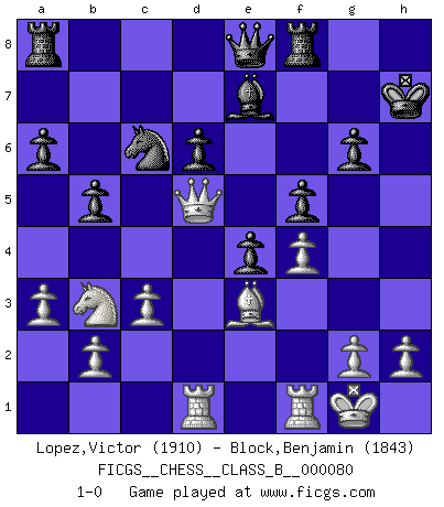Last move : 1-0 2009 November 23 20:43:23 [Event "FICGS__CHESS__CLASS_B__000080"] [Site "FICGS"] [Date "2009.07.13"] [Round "1"] [White "Lopez,Victor"] [Black "Block,Benjamin"] [Result "1-0"] [WhiteElo "1910"] [BlackElo "1843"] 1.e4 c5 2.Nf3 d6 3.d4 cxd4 4.Nxd4 Nf6 5.Nc3 a6 6.Be3 e5 7.Nb3 Be6 8.Bd3 Be7 9.O-O O-O 10.Nd5 Nc6 11.c3 Nxd5 12.exd5 Bxd5 13.Bxh7+ Kxh7 14.Qxd5 f5 15.Rad1 Qe8 16.Nd2 b5 17.f4 e4 18.Nb3 g6 19.a3 1-0 Sicilian : Najdorf, Byrne (English) attack Kingside Castling by player White (move 9) Kingside Castling by player Black (move 9) Player White won this chess game. Follow this game move after move (download)The passed Pawn is a criminal, who should be kept under lock and key. Mild measures, such as police surveillance, are not sufficient. (Aaron Nimzovich) Pläne sind die Träume des Verständigen. (Ernst Freiherr von Feuchtersleben) El estómago es una parte esencial del maestro de Ajedrez. (Bent Larsen) Il vaut mieux sacrifier les pièces de l'adversaire. (Xavier Tartacover) The obstacle is the path. (Zen proverb)