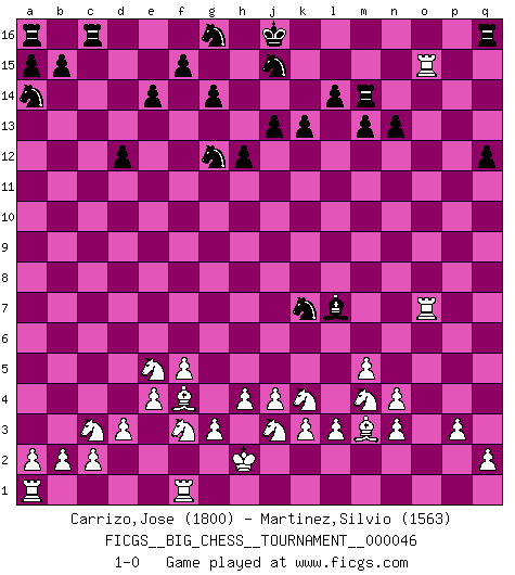 Last move : 1-0 2009 September 23 4:41:28 [Event "FICGS__BIG_CHESS__TOURNAMENT__000046"] [Site "FICGS"] [Date "2009.07.14"] [Round "1"] [White "Carrizo,Jose"] [Black "Martinez,Silvio"] [Result "1-0"] [WhiteElo "1800"] [BlackElo "1563"] 1.j2-k4 o15-o14 2.h1-o7 g15-g14 3.o7-c7 h15-j13 4.c7-c15 b16-a14 5.c15-o4 k16-l14 6.b1-c3 h16-f14 7.h2-g4 m15-m14 8.n2-n4 d15-d14 9.d2-d3 h14-h13 10.e2-e4 f14-a9 11.g2-g3 l16-q11 12.f2-f4 p15-p13 13.p1-o3 d14-d13 14.j1-h2 q15-q13 15.g1-f3 e15-e14 16.g4-e5 e16-d16 17.h3-h4 q11-f1 18.e1-f1 f16-d14 19.o4-q6 d14-f16 20.m2-m4 j13-g12 21.q6-q7 q13-q12 22.m4-m5 f16-c13 23.l1-n3 c13-n3 24.o2-n3 c16-d15 25.o1-m3 n15-n13 26.o3-m4 m14-m13 27.q1-o1 o16-h10 28.p2-p3 d15-a12 29.k2-k3 d16-c16 30.j3-j4 h10-m6 31.l2-l3 p16-q14 32.o1-o14 q14-p12 33.o14-o2 k15-k13 34.q7-p6 a9-p9 35.p6-k11 l14-m12 36.k11-k7 a12-c14 37.m4-o5 d13-d12 38.k7-j6 m6-g11 39.k1-j3 m16-m14 40.f4-f5 c14-g10 41.c1-p13 p12-o10 42.p13-n11 m12-l10 43.n11-f4 p9-q8 44.o5-m4 j14-j13 45.j6-n10 l10-m8 46.n10-g10 h13-h12 47.g10-o10 q8-o10 48.o2-o10 g11-l7 49.o10-o15 l15-l14 50.m1-o1 m8-k7 51.o1-o7 1-0 Follow this game move after move (download)Chess is a beautiful mistress. (Bent Larsen) Man gibt nur Pakete auf. (Paul Keres) Aquellos que dicen que entienden al Ajedrez, no entienden nada. (Robert Hubner) Mon pion favori sur ma case favorite ! Bronstein en parlant d'un coup de pion en h5 quand il avait les Noirs. I think your argument is specious - I think your tie is ugly. (Gregory House to Dr. Foreman, House M.D.)