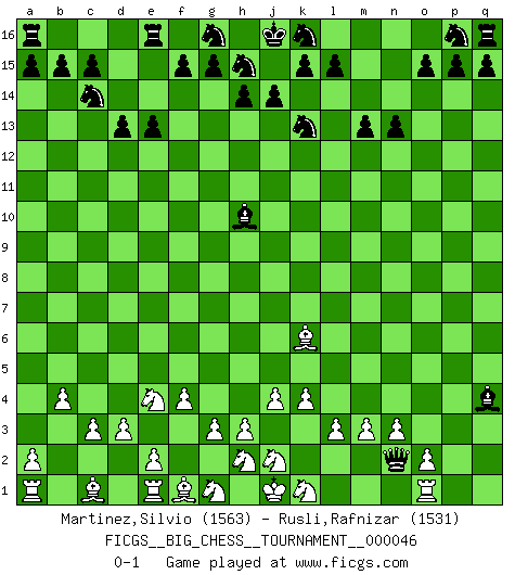 Last move : 0-1 2009 October 16 1:19:28 [Event "FICGS__BIG_CHESS__TOURNAMENT__000046"] [Site "FICGS"] [Date "2009.07.14"] [Round "1"] [White "Martinez,Silvio"] [Black "Rusli,Rafnizar"] [Result "0-1"] [WhiteElo "1563"] [BlackElo "1531"] 1.k2-k4 j15-k13 2.p1-o3 h16-o10 3.g2-g3 m15-m13 4.h1-c6 b16-c14 5.c2-c3 d15-d13 6.f2-f4 e15-e13 7.l2-l3 n15-n13 8.j3-j4 c16-k9 9.d2-d3 l16-o13 10.c6-d6 o16-d6 11.n2-n3 k9-j8 12.o1-n2 j8-h7 13.n2-h7 o13-h7 14.l1-h4 o10-o11 15.b1-d2 h7-n2 16.m1-n1 n2-o3 17.p2-o3 o11-o3 18.n1-o1 m16-m14 19.d2-e4 d6-h10 20.q2-q4 m14-q14 21.m2-m3 f16-e15 22.b2-b4 q14-q4 23.q1-q4 e15-q4 24.h4-k6 o3-n2 0-1 Follow this game move after move (download)The blunders are all there on the board, waiting to be made. (Savielly Tartakover) Intelligenz läßt sich nicht am Weg, sondern nur am Ergebnis feststellen. (Garry Kasparov) ¡Examina movidas que hagan daño! Un buen ojo for movidas desvastantes es mucho mas importante que el conocimiento de principios estratégicos. (Purdy) La tactique est l'élément le plus important du milieu de jeu. (Siegbert Tarrasch) Excelling at chess has long been considered a symbol of more general intelligence. That is an incorrect assumption in my view, as pleasant as it might be. But for the purposes of argument and investigation, chess is, in Russkin-Gutman's words, 'an unparalleled laboratory, since both the learning process and the degree of ability obtained can be objectified and quantified, providing an excellent comparative framework on which to use rigorous analytical techniques.' (The Chess Master and the Computer, by Garry Kasparov - 2010)