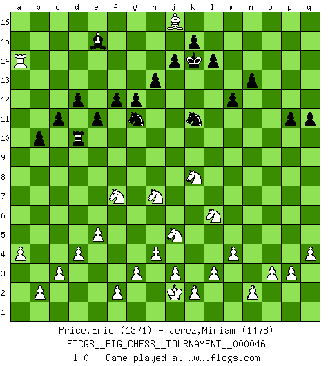 Last move : 1-0 2010 April 8 8:44:56 [Event "FICGS__BIG_CHESS__TOURNAMENT__000046"] [Site "FICGS"] [Date "2009.07.14"] [Round "1"] [White "Price,Eric"] [Black "Jerez,Miriam"] [Result "1-0"] [WhiteElo "1371"] [BlackElo "1478"] 1.p1-o3 f15-f13 2.j2-h4 g15-g14 3.h2-j4 o15-o14 4.b1-c3 h16-d12 5.m2-m4 b16-c14 6.l1-n3 d12-d6 7.k1-h2 l15-l14 8.a2-a4 d6-f8 9.g1-f3 p16-q14 10.d2-d4 m15-m13 11.c1-h6 f8-l13 12.h1-k3 l16-o13 13.e2-e4 l13-k13 14.f1-b5 k13-k3 15.h2-k3 n15-n13 16.p2-p3 h14-h13 17.h6-k8 e15-e14 18.o1-p2 b15-b14 19.o3-n5 d15-d14 20.p2-c14 o16-d6 21.g2-g3 c16-b15 22.c14-b15 a16-b16 23.b15-c14 e16-d16 24.n3-p5 g16-e15 25.p5-e15 f16-e15 26.m1-m3 q14-p12 27.m3-o3 e14-e13 28.o3-o13 p15-p14 29.o13-o3 m13-m12 30.e4-e5 d6-g9 31.k8-g11 m16-m13 32.c14-k7 f13-f12 33.g11-l15 o14-o13 34.b5-c4 m13-k13 35.k7-p12 o13-p12 36.e1-e4 q16-l16 37.o3-o15 q15-q13 38.e4-g4 e15-j11 39.g4-g8 k13-l13 40.q1-l1 j15-k13 41.l15-k16 l16-k16 42.g8-o8 k13-m14 43.o15-o16 k16-o16 44.o8-o16 j16-j15 45.o16-d16 b16-d16 46.l1-m1 c15-c13 47.l2-l3 h15-j13 48.m1-m3 a15-a13 49.m3-o3 d14-d13 50.j1-j2 d13-d12 51.a1-m1 b14-b13 52.m1-m3 c13-c12 53.o3-o14 l13-l10 54.o14-p14 m14-n12 55.m3-o3 b13-b12 56.o3-o15 n12-m14 57.o15-q15 l10-q10 58.q2-q4 a13-a12 59.p14-p16 d16-p16 60.c4-p16 c12-c11 61.c3-d5 m14-n16 62.p16-o15 n16-o14 63.q15-q16 q13-q12 64.q16-b16 b12-b11 65.d5-f6 o14-n12 66.f6-h7 g9-h10 67.f3-g5 b11-b10 68.k3-j5 n12-m14 69.o15-f7 a12-a11 70.f7-b11 q10-o10 71.o2-o3 g14-g13 72.j4-k6 m14-k13 73.h4-j6 j15-k14 74.j6-h8 k13-h14 75.h8-k9 j13-k11 76.k9-j11 h10-j11 77.h3-h4 p12-p11 78.k6-m7 e13-e12 79.b16-b12 o10-d10 80.c2-c3 e12-e11 81.m7-k8 g13-g12 82.n5-l6 j11-e15 83.b12-b14 h14-f13 84.g5-f7 e15-d16 85.b14-b16 d16-c15 86.b16-a16 f13-g11 87.a16-a11 c15-d14 88.a11-a14 d14-e15 89.b11-g16 q12-q11 90.g16-h15 k14-j15 91.h15-a8 j15-k14 92.a8-j16 1-0 This big chess game has been lost on time (started : 2009.07.14 11:16:33) Follow this game move after move (download)I'm not a materialistic person, in that, I don't suffer the lack or loss of money. The absence of worldly goods I don't look back on. For Chess is a way I can be as materialistic as I want without having to sell my soul. (Jamie Walter Adams) Die meiste Zeit treffe ich auf Gegner, die meine Enkel sein könnten. Ich bin da, um ihnen zu zeigen, dass sie von mir noch einiges lernen können. (Viktor Kortschnoi) Vive, pierde y aprende al observar a tu oponente como ganar. (Amber Steenbock) Aux échecs, les retours au sommet sont rares : les dommages psychologiques consécutifs à une défaite sont trop sévères. (Daily Telegraph) Treat your password like your toothbrush. Don't let anybody else use it, and get a new one every six months. (Clifford Stoll)
