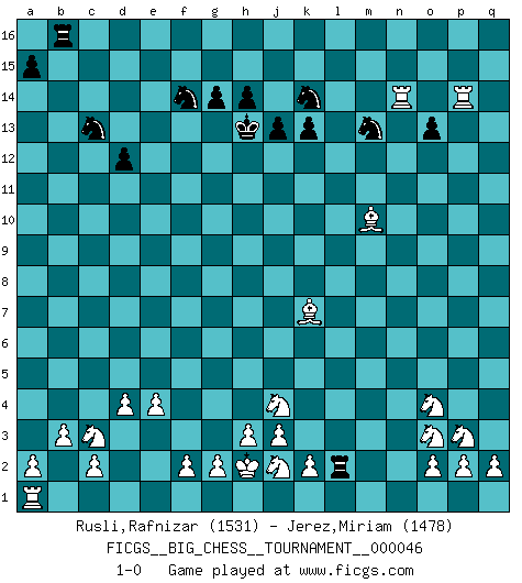 Last move : 1-0 2010 March 12 21:52:48 [Event "FICGS__BIG_CHESS__TOURNAMENT__000046"] [Site "FICGS"] [Date "2009.07.14"] [Round "1"] [White "Rusli,Rafnizar"] [Black "Jerez,Miriam"] [Result "1-0"] [WhiteElo "1531"] [BlackElo "1478"] 1.j2-k4 o15-o14 2.h1-o7 h15-g13 3.o7-l7 k16-l14 4.l7-c15 b16-a14 5.c15-g11 k15-k14 6.e2-e4 g13-e12 7.g11-f11 e12-f14 8.n2-n4 j14-j13 9.f11-p11 m15-m14 10.f1-e2 p16-q14 11.e2-o11 q14-o13 12.p11-q10 l16-k15 13.q10-q9 o13-m12 14.o11-p10 n15-n13 15.o1-h7 p15-p14 16.d2-d4 m12-n10 17.h7-n12 n10-o8 18.q9-b9 h16-h15 19.b9-h15 f14-h15 20.p10-n8 o14-o13 21.n8-f15 e16-d16 22.n12-j8 e15-e14 23.f15-o7 d15-d13 24.m2-m4 m14-m13 25.c1-m10 o8-m7 26.o7-n6 e14-e13 27.k4-m5 k15-g12 28.l1-o4 q15-q13 29.n6-p8 m13-m12 30.n4-n5 f16-e15 31.k1-l3 n13-n12 32.l3-n4 o16-g9 33.h2-j4 e15-c13 34.n5-n6 n12-n11 35.m10-p7 m7-l9 36.j8-g10 g12-n6 37.p8-n6 c16-n6 38.o4-e13 g9-m4 39.p7-m4 c13-m4 40.m1-m4 j15-h13 41.g10-l14 j16-j15 42.m5-o4 n6-o5 43.m4-l4 l9-j10 44.n4-p3 o5-k9 45.l14-j12 g15-g14 46.l4-l15 j15-j14 47.j12-k11 d16-e16 48.e13-j9 j10-k12 49.p1-o3 a14-b12 50.q1-m1 q16-o16 51.m1-m12 m16-m12 52.j9-m12 n11-n10 53.b1-c3 o16-m16 54.m12-g7 b12-d11 55.k11-l12 k14-k13 56.l12-n10 h15-k14 57.l15-b15 g16-f14 58.j1-h2 d13-d12 59.g1-j2 d11-c13 60.b15-b9 k14-l12 61.b9-k9 l12-j11 62.k9-p9 m16-m10 63.p9-p14 h13-k14 64.n10-q13 j11-l12 65.e1-n1 l12-n11 66.n1-n11 k12-m13 67.n11-n14 j14-h13 68.q13-k7 a16-b16 69.g7-h6 e16-l16 70.h6-m10 l16-l2 71.b2-b3 1-0 This big chess game has been lost on time (started : 2009.07.14 11:16:33) Follow this game move after move (download)Place the contents of the Chess box in a hat, shake them up vigorously, pour them on the board from a height of two feet, and you get the style of Steinitz. (H. E. Bird) Kein Schachspieler kann gut schlafen. (H. G. Wells) No hay precio que no valga la pena por la cabellera del Rey enemigo. (Koblentz) Les échecs, c'est la lutte contre l'erreur. (Johannes Zukertort) Wisdom doesn't necessarily come with age. Sometimes age just shows up all by itself. (Tom Watson)