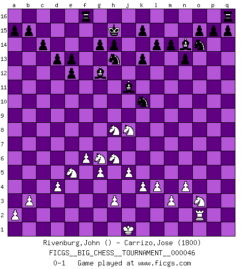 Last move : 0-1 2009 October 25 7:28:51 [Event "FICGS__BIG_CHESS__TOURNAMENT__000046"] [Site "FICGS"] [Date "2009.07.14"] [Round "1"] [White "Rivenburg,John"] [Black "Carrizo,Jose"] [Result "0-1"] [WhiteElo ""] [BlackElo "1800"] 1.g2-g4 j15-k13 2.k2-k4 h16-o10 3.f1-g2 o10-f2 4.e1-f1 f2-c5 5.n2-n4 c5-c2 6.o1-f9 h15-g13 7.f9-k13 j14-k13 8.b1-a3 c2-h7 9.g2-e4 h7-m7 10.m2-m3 m7-m4 11.l2-l3 m4-o2 12.j2-h4 o2-p2 13.e4-j8 p2-q1 14.h1-j2 e15-e14 15.j2-m2 f16-d14 16.d2-d3 q1-q2 17.m2-q2 d14-q2 18.l1-n3 d15-d13 19.m1-m2 q2-h10 20.h4-j6 c15-c14 21.c1-k8 n15-n14 22.k8-h10 o16-h10 23.a1-c1 e14-e13 24.n3-h8 p16-o14 25.m2-o2 m15-m14 26.h2-j4 n14-n13 27.j4-h6 l16-n14 28.g1-f3 c16-g12 29.g4-g5 f15-f13 30.f3-h4 g15-g14 31.k1-h2 l15-l14 32.h2-j4 k16-j14 33.h4-g6 b16-d15 34.j4-k6 d15-f14 35.p1-o3 f14-e12 36.j8-e12 f13-e12 37.a3-c4 j16-h15 38.c4-e5 g16-j15 39.e2-e4 e16-f16 40.l3-l4 f16-f1 41.c1-f1 m16-f16 42.f1-f5 f16-f5 43.e4-f5 j15-h13 44.b2-b3 j14-k12 45.d3-d4 k12-j10 46.k6-j8 h10-j11 47.j3-j4 j10-h8 48.j6-h8 a16-f16 49.f5-f6 g13-j12 50.j4-j5 j12-k10 0-1 This big chess game has been lost on time (started : 2009.07.14 11:16:33) Follow this game move after move (download)It is always better to sacrifice your opponent's men. (Savielly Tartakower) Ich habe die besten Aussichten, den ersten Preis zu gewinnen - denn jeder muss gegen Steinitz spielen, nur ich nicht! (Wilhelm Steinitz) En la perfecta combinación de Ajedrez como en una historia corta de primera clase, toda la trama y contra trama deberá conducir hacia un final sorprendente, el interes no es mitigado hasta el último momento. (Yates and Winter) Les Cavaliers se révèlent fort utiles dans les positions fermées. D'habitude, les Fous sont un peu plus forts que les Cavaliers dans les positions ouvertes. Qu'on le veuille ou non, il restera toujours des exceptions ! Train yourself to let go of everything you fear to lose. (Master Yoda in Star Wars ep.3)