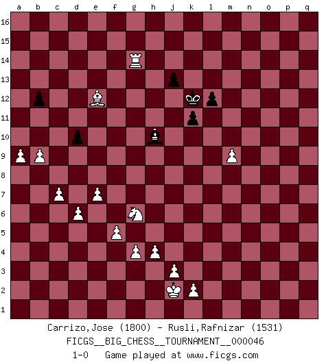 Last move : 1-0 2010 July 13 9:27:0 [Event "FICGS__BIG_CHESS__TOURNAMENT__000046"] [Site "FICGS"] [Date "2009.07.14"] [Round "1"] [White "Carrizo,Jose"] [Black "Rusli,Rafnizar"] [Result "1-0"] [WhiteElo "1800"] [BlackElo "1531"] 1.j2-k4 p16-o14 2.h1-o7 g15-g14 3.o7-c7 j15-k13 4.c7-c15 h16-o10 5.h2-g4 o10-o2 6.p1-o3 o2-l5 7.g1-f3 d15-d14 8.c15-c7 c16-o5 9.m2-m4 l5-l10 10.d2-d3 o5-l2 11.k4-l2 l10-l2 12.k1-l3 n15-n13 13.c7-b8 b15-b14 14.b8-j8 b16-d15 15.n2-n4 m15-m13 16.f3-h2 l2-f7 17.o1-g8 f7-f8 18.c1-h6 f8-b4 19.b2-b3 o16-d6 20.c2-c3 b4-b8 21.g2-g3 a16-c16 22.g8-h7 b8-c7 23.e2-e4 p15-p14 24.e4-e5 d6-g9 25.j8-g8 g9-j11 26.c3-c4 c16-c8 27.g8-g6 e16-c16 28.b1-c3 j11-b4 29.c3-d5 c7-a5 30.d5-b4 a5-b4 31.q1-o1 l16-m15 32.h6-p13 c8-c6 33.g6-f5 c6-o6 34.o3-n5 c16-c6 35.g4-f6 o6-o1 36.m1-o1 o14-q13 37.p13-m16 q16-m16 38.o1-o15 q13-o12 39.o15-q15 n13-n12 40.l1-p5 m16-o16 41.n5-o3 o12-q13 42.f6-d5 b4-k12 43.f5-f15 k13-j15 44.f15-f11 c6-k6 45.h2-j4 k6-k7 46.h7-b13 d15-c13 47.p5-j11 k12-k11 48.b13-c14 k7-f7 49.f11-h9 k11-j11 50.h9-f7 l15-l14 51.f7-e7 j11-e7 52.d5-e7 h14-h13 53.f1-e2 f16-k12 54.j1-h2 k12-e7 55.e1-o1 m15-n16 56.o3-n5 o16-p16 57.o1-o7 e7-b4 58.a1-o1 h15-k14 59.d3-d4 k16-m15 60.c4-c5 j15-l16 61.j4-g5 l16-m14 62.g5-f3 m14-o13 63.q15-q13 p14-q13 64.o7-o13 p16-p2 65.o13-o2 p2-p11 66.o2-o7 p11-k11 67.h2-j2 b4-a5 68.o7-a7 a5-f10 69.n5-l6 a15-a14 70.a7-f7 f10-d12 71.f7-p7 k11-a11 72.a2-a4 k14-l12 73.f3-g5 g16-f14 74.c14-h9 l12-m14 75.p7-p16 j16-j15 76.h9-k7 q13-q12 77.k7-q13 n16-q13 78.e2-q13 m14-l12 79.m4-m5 d12-h8 80.p16-f16 j15-k14 81.o1-o8 h8-l11 82.o8-k8 k14-l15 83.f16-f15 l12-k14 84.f15-e15 a11-d11 85.g5-e6 f14-e12 86.q13-k7 d14-d13 87.k8-q8 l11-n9 88.h3-h4 d11-e11 89.k7-h9 e11-e9 90.h9-f7 e9-f9 91.e6-g5 n9-m10 92.q8-q7 c13-d11 93.f2-f4 g14-g13 94.a4-a5 m15-n13 95.b3-b4 n13-o11 96.b4-b5 b14-b13 97.a5-a6 d11-c13 98.b5-b6 g13-g12 99.a6-a7 q12-q11 100.d4-d5 q11-q10 101.c5-c6 k14-l12 102.b6-b7 l12-j13 103.d5-d6 o11-p9 104.q7-m7 n12-n11 105.a7-a8 p9-n10 106.m7-l7 q10-q9 107.e15-e16 f9-f8 108.f7-h5 n10-p11 109.l7-q7 q9-q8 110.e16-p16 p11-n12 111.p16-d16 e12-c11 112.c6-c7 n12-o10 113.b7-b8 m10-p7 114.q7-q5 o10-q9 115.a8-a9 q9-o8 116.g5-h3 f8-h8 117.g3-g4 q8-q7 118.f4-f5 q7-q6 119.d16-p16 h8-h7 120.h3-j5 h7-o7 121.q5-o5 o7-o5 122.n4-o5 p7-o6 123.p16-o16 o6-p7 124.o5-o6 p7-o6 125.o16-o8 o6-p7 126.o8-o11 m13-m12 127.l6-n7 j13-l12 128.n7-o5 p7-l11 129.j5-g6 l11-j9 130.q2-q3 j9-l11 131.o11-q11 l14-l13 132.o5-q6 l12-m10 133.q6-o7 l15-k14 134.q3-q4 c11-e12 135.q4-q5 m10-n12 136.q5-q6 n12-o10 137.q11-q14 k14-j13 138.q6-q7 e12-g11 139.q7-q8 g11-j12 140.q8-q9 j12-k10 141.q9-q10 k10-m11 142.o7-p9 m11-o12 143.p9-n10 o12-n10 144.h5-n10 m12-m11 145.n10-o11 k15-k14 146.q10-q11 n11-n10 147.q11-q12 o10-q11 148.q12-q13 q11-p13 149.o11-m13 l11-m10 150.q14-q16 p13-q11 151.q13-q14 q11-p13 152.m13-l12 k14-k13 153.l12-m11 n10-n9 154.q14-q15 l13-l12 155.m11-l10 p13-q15 156.q16-q15 j13-k14 157.l3-k5 d13-d12 158.k5-m6 m10-l11 159.m6-l8 d12-d11 160.q15-n15 l11-k12 161.n15-n14 k14-j13 162.l8-n9 j13-h12 163.m5-m6 k12-l11 164.m6-m7 h12-j13 165.m7-m8 k13-k12 166.l10-n12 j13-k13 167.n12-k15 j14-j13 168.k15-h13 g12-g11 169.n9-l10 d11-d10 170.n14-c14 c13-e12 171.c14-a14 l11-k10 172.m8-m9 k13-l13 173.e5-e6 k12-k11 174.l10-k8 k10-j11 175.e6-e7 j11-h10 176.k8-h9 l13-k12 177.h13-f11 e12-c11 178.a14-g14 c11-b9 179.h9-g11 b9-c11 180.g11-e12 c11-e12 181.f11-e12 b13-b12 182.b8-b9 1-0 This big chess game has been lost on time (started : 2009.07.14 11:16:33) Follow this game move after move (download)In order to improve your game, you must study the endgame before everything else, for whereas the endings can be studied and mastered by themselves, the middle game and the opening must be studied in relation to the endgame. (Jose Raul Capablanca) Am wohlsten fühle ich mich, wenn ich sehe, wie sich mein Gegner im Todeskampf windet. (Robert James Fischer) Bobby Fischer es el mas grande genio de Ajedrez de todos los tiempos. (Alexander Kotov) Il (Jacob Murray) ne joue pas pour le bon coup, mais pour le meilleur. (Eloi Relange) Man is reluctant to give credit for intelligence to anyone, except his enemies. (Albert Einstein)