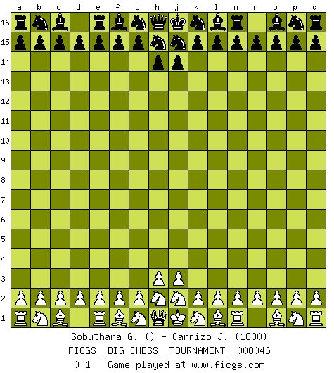 Last move : 0-1 2009 August 13 20:14:18 [Event "FICGS__BIG_CHESS__TOURNAMENT__000046"] [Site "FICGS"] [Date "2009.07.14"] [Round "1"] [White "Sobuthana,Gugulethu"] [Black "Carrizo,Jose"] [Result "0-1"] [WhiteElo ""] [BlackElo "1800"] 0-1 This big chess game has been lost on time (started : 2009.07.14 11:16:33) Follow this game move after move (download)When you don't know what to do, wait for your opponent to get an idea - it's sure to be wrong. (Tarrasch) Es ist peinlich, dass ich nie Weltmeister wurde. Es wäre leicht, Leonid Breschnjew als Ursache vorzuschieben, dessen Apparat den Vorzeigekommunisten Anatoli Karpow in allem unterstützte. Aber Garri Kasparow zum Beispiel, der ebenfalls von den Sowjets unerwünscht war, hat trotz der Widerstände den WM-Titel erobert. (Viktor Kortschnoi) No todos los artistas son jugadores de Ajedrez, pero todos los jugadores de Ajedrez son artistas. (Marcel Duchamp) Un millionnaire : 'Monsieur Steinitz ! Vous ne participez aux tournois que pour l'argent, alors que moi je n'y viens que pour l'honneur.' Steinitz : 'Chacun joue pour ce qu'il n'a pas'... You must have a dream in order to have it come true. (A.P.J. Kalam)