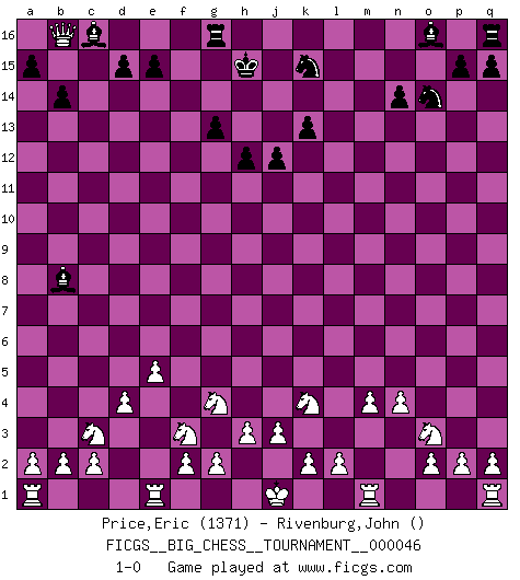 Last move : 1-0 2009 October 18 9:25:34 [Event "FICGS__BIG_CHESS__TOURNAMENT__000046"] [Site "FICGS"] [Date "2009.07.14"] [Round "1"] [White "Price,Eric"] [Black "Rivenburg,John"] [Result "1-0"] [WhiteElo "1371"] [BlackElo ""] 1.p1-o3 k15-k13 2.j2-k4 g15-g13 3.h2-g4 l16-k15 4.b1-c3 k15-o11 5.k1-h2 o11-g4 6.h2-g4 g16-f14 7.h1-o7 k16-l14 8.o7-f15 h16-g16 9.f15-o7 h14-h13 10.o7-o15 l14-n13 11.o15-m13 n13-l14 12.m13-m6 f16-k12 13.m6-c15 f14-g12 14.n2-n4 k12-h10 15.c15-c7 b15-b14 16.c7-l15 m16-l16 17.l15-m15 l16-m16 18.m15-q11 p16-o14 19.e2-e4 h15-j13 20.f1-a6 l14-k12 21.a6-e10 g16-e14 22.m2-m4 j15-g14 23.e10-d11 h10-d6 24.e4-e5 d6-b8 25.d2-d4 m16-n16 26.c1-n11 e14-d14 27.l1-q6 n15-n14 28.q11-o11 j16-h15 29.g1-f3 d14-d11 30.o1-d11 n16-m16 31.q6-l11 k12-m11 32.n11-k14 m16-m14 33.k14-j13 e16-g16 34.j13-g11 h13-h12 35.o11-k15 h15-h16 36.g11-b16 a16-b16 37.d11-g14 g16-g14 38.l11-m12 m14-m12 39.k15-k14 h16-h15 40.k14-m12 j14-j13 41.m12-m11 g12-h14 42.m11-m16 h14-k15 43.m16-d16 g14-g16 44.d16-c15 j13-j12 45.c15-b16 1-0 This big chess game has been lost on time (started : 2009.07.14 11:16:33) Follow this game move after move (download)If you aren't afraid of Spassky, then I have removed the element of money. (Jim Slater) Im Reiche der Wirklichkeit ist man nie so glücklich wie im Reiche der Gedanken. (Arthur Schopenhauer) ¿Se han dado cuenta de que Fischer casi nunca ha tenido piezas malas? El las intercambia y las piezas malas se quedan con sus oponenets. (Yuri Balashov) On croit qu'il y a plus de mauvais joueurs que de bons joueurs, c'est faux : Il y a autant de joueurs qui gagnent que de joueurs qui perdent. (Philippe Geluck) Nothing is more important for teaching us to understand the concepts we have than constructing fictitious ones. (Ludwig Wittgenstein)