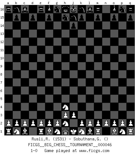 Last move : 1-0 2009 August 15 8:35:23 [Event "FICGS__BIG_CHESS__TOURNAMENT__000046"] [Site "FICGS"] [Date "2009.07.14"] [Round "1"] [White "Rusli,Rafnizar"] [Black "Sobuthana,Gugulethu"] [Result "1-0"] [WhiteElo "1531"] [BlackElo ""] 1.j2-h4 1-0 This big chess game has been lost on time (started : 2009.07.14 11:16:33) Follow this game move after move (download)Chess is like war on a board. (Bobby Fischer) Der Verteidiger gebe der Gewalt nach, aber nur der Gewalt. Er schaffe sich nicht freiwillig, etwa aus Blindheit oder aus Schrecken, irgendwelche Schwächen. Er lasse sich nicht bluffen. (Emanuel Lasker) Solo los afeminados hacen el Enroque. (Rob Sillars) Le plus grand jeu de l'esprit jamais inventé, plus vous l'apprenez, plus vous y prenez du plaisir. (Garry Kasparov) Bobby never cared about money, though. His only desire was to prove that his choices were correct: He wanted chess to be important because he was a chess player, and he wanted to be important. Bobby knew money was important, but he didn't have a clue why, outside of clothes and status. The only way he could accomplish what he wanted was to fight for a lot of money. Once he got it, he gave it away. He did not know how to spend it. And once he'd become champion, after, essentially, sacrificing his life for it, he didn't know how to spend his time. (Bob Wade)