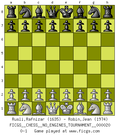 Last move : 0-1 2009 July 16 7:48:35 [Event "FICGS__CHESS__NO_ENGINES_TOURNAMENT__000020"] [Site "FICGS"] [Date "2009.07.15"] [Round "1"] [White "Rusli,Rafnizar"] [Black "Robin,Jean"] [Result "0-1"] [WhiteElo "1635"] [BlackElo "1974"] 0-1 Player Black won this chess game. Follow this game move after move (download)Good offense and good defense both begin with good development. (Bruce A. Moon) Besser ein falscher Plan, logisch durchgeführt, als gar kein Plan. (Viktor Kortschnoi) La partida mas dura de ganar es una partida ganada. (Emanuel Lasker) On est toujours la mazette de quelqu'un d'autre. (Anonyme) For a mechanic, you seem to do an excessive amount of thinking. (C-3PO in Star Wars ep.2)