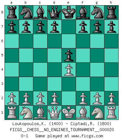 Last move : 0-1 2009 September 22 22:26:54 [Event "FICGS__CHESS__NO_ENGINES_TOURNAMENT__000020"] [Site "FICGS"] [Date "2009.07.15"] [Round "1"] [White "Loukopoulos,Klearchos"] [Black "Ciptadi,Richard"] [Result "0-1"] [WhiteElo "1400"] [BlackElo "1800"] 1.e4 e5 0-1 King's pawn game Player Black won this chess game. Follow this game move after move (download)Good positions don't win games, good moves do. (Gerald Abrahams) Der 70jährige Viktor Kortschnoi: Die Rentenanstalt wollte mich zwingen in Rente zu gehen. Meine Frau erhält jetzt eine Pension- und ich zahle weiter in die Rentenkasse ein! (Viktor Kortschnoi) ¿Se han dado cuenta de que Fischer casi nunca ha tenido piezas malas? El las intercambia y las piezas malas se quedan con sus oponenets. (Yuri Balashov) Les échecs sont un jeu par leur forme, un art par leur essence et une science par sa difficulté d'acquisition. Ils peuvent vous procurer autant de plaisir qu'un bon livre ou une belle musique, mais vous n'aurez une réelle joie que si vous arrivez à bien jouer. (Tigran Petrosian) A woman without a man is like a fish without a bicycle. (Gloria Steinem)