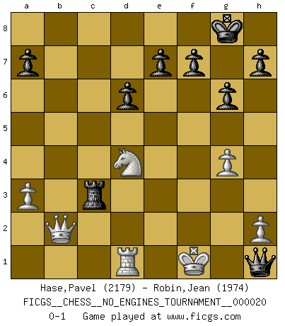 Last move : 0-1 2009 August 8 11:14:8 [Event "FICGS__CHESS__NO_ENGINES_TOURNAMENT__000020"] [Site "FICGS"] [Date "2009.07.15"] [Round "1"] [White "Hase,Pavel"] [Black "Robin,Jean"] [Result "0-1"] [WhiteElo "2179"] [BlackElo "1974"] 1.e4 d6 2.d4 Nf6 3.Nc3 g6 4.Be3 Bg7 5.Qd2 c6 6.Bh6 Bxh6 7.Qxh6 Qa5 8.f3 b5 9.Bd3 b4 10.Nce2 Ba6 11.Bxa6 Nxa6 12.c3 bxc3 13.Nxc3 Rb8 14.Qd2 c5 15.Nge2 Qb6 16.Rb1 O-O 17.O-O Rfc8 18.Rfd1 Nb4 19.g4 cxd4 20.Qxd4 Qa5 21.a3 Nc6 22.Qd2 Ne5 23.Kg2 Nc4 24.Qc1 Rb3 25.Nd4 Rxb2+ 26.Rxb2 Nxb2 27.Qxb2 Rxc3 28.Nc2 Qe5 29.Nd4 Nxg4 30.fxg4 Qxe4+ 31.Kf1 Qh1+ 0-1 Pirc defense Kingside Castling by player Black (move 16) Kingside Castling by player White (move 17) Player Black won this chess game. Follow this game move after move (download)Bobby Fischer is the greatest Chess player who has ever lived. (Ken Smith) Es gibt Leute, die glauben, alles wäre vernünftig, was man mit einem ernsthaften Gesicht tut. (Georg Christoph Lichtenberg) El Ajedrez es tan inspirador que yo no creo que un buen jugador sea capaz de tener un pensamiento malo durante una partida. (Wilhelm Steinitz) Toutes choses étant égales, c'est la conviction qui gagne. Alliée à une volonté de vaincre, elle sert de détonateur, suscite des idées, disperse les doutes et aide à penser clairement. (Robert Fischer) There will be no order, only chaos. (Sol Robeson in Pi by Darren Aronofsky)