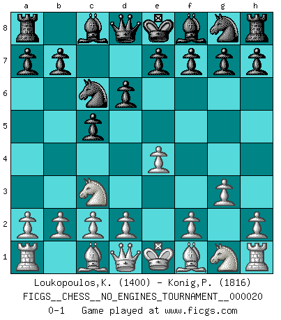 Last move : 0-1 2009 September 23 9:42:29 [Event "FICGS__CHESS__NO_ENGINES_TOURNAMENT__000020"] [Site "FICGS"] [Date "2009.07.15"] [Round "1"] [White "Loukopoulos,Klearchos"] [Black "Konig,Paul"] [Result "0-1"] [WhiteElo "1400"] [BlackElo "1816"] 1.e4 c5 2.Nc3 Nc6 3.g3 d6 0-1 Sicilian : Closed Player Black won this chess game. Follow this game move after move (download)Play the opening like a book, the middle game like a magician, and the endgame like a machine. (Spielmann) Alle Schachspieler sollten auch ein Hobby haben. (Savielly Grigorievitsch Tartakower) Cuando me preguntan: -¿Cual es el secreto que te hace hacer mejores movidas que tus oponentes?, Yo respondo: Me da gusto que me pregunten eso, porque, como veran, hay una simple razón. Yo pienso mis propias movidas y dejo a mi oponente que el piense las suyas. (Alexander Alekhine) Les ravages du H expliquent la différence de niveau entre Tal et Thal [Abergel]. Everybody lies. (Gregory House, House M.D.)