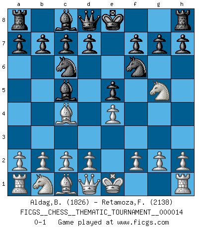 Last move : 0-1 2006 November 19 2:5:8 [Event "FICGS__CHESS__THEMATIC_TOURNAMENT__000014"] [Site "FICGS"] [Date "2006.09.20"] [Round "1"] [White "Aldag,Benjamin"] [Black "Retamoza,Francisco"] [Result "0-1"] [WhiteElo "1826"] [BlackElo "2138"] 1.e4 e5 2.Nf3 Nc6 3.Bc4 Nf6 4.Ng5 Bc5 0-1 Two knights defense : Wilkes Barre (Traxler) variation Player Black won this chess game. Follow this game move after move (download)I give 98 percent of my mental energy to Chess. Others give only 2 percent. (Bobby Fischer) Wenn sie aufgeben, dann danke ich Ihnen für das Spiel (Eventualzug beim Fernschach). (Anonymous) Aquel que teme a un Peón de Reina aislado, debería de retirarse del Ajedrez. (Siegbert Tarrasch) Les erreurs sont comme les malheurs, elles n'arrivent jamais seules. (Siegbert Tarrasch) Computer Science is no more about computers than astronomy is about telescopes. (Edsger W. Dijkstra)