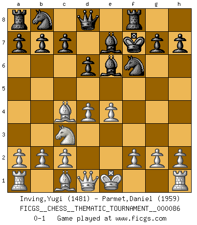 Last move : 0-1 2009 August 10 6:30:8 [Event "FICGS__CHESS__THEMATIC_TOURNAMENT__000086"] [Site "FICGS"] [Date "2009.07.16"] [Round "1"] [White "Inving,Yugi"] [Black "Parmet,Daniel"] [Result "0-1"] [WhiteElo "1481"] [BlackElo "1959"] 1.e4 e5 2.Nf3 Nf6 3.Nxe5 d6 4.Nxf7 Kxf7 5.d4 Be7 6.Nc3 Rf8 7.Bc4+ Be6 0-1 Petrov : Cochrane gambit Player Black won this chess game. Follow this game move after move (download)By this measure (on the gap between Fischer & his contemporaries), I consider him the greatest world champion. (Garry Kasparov) Spielt Blackmar-Diemer-Gambit, und das Matt kommt von selbst! (Emil Joseph Diemer) El Ajedrez es un juego terrible. Si no dominas el centro, tu oponente tiene una posición mas libre. Si tu tienes el centro, entonces realmente tienes algo de que preocuparte. (Siegbert Tarrasch) Les échecs sont un jeu par leur forme, un art par leur essence et une science par sa difficulté d'acquisition. Ils peuvent vous procurer autant de plaisir qu'un bon livre ou une belle musique, mais vous n'aurez une réelle joie que si vous arrivez à bien jouer. (Tigran Petrosian) He who fights with monsters should be careful lest he thereby become a monster. (Friedrich Nietzsche, Beyond Good and Evil)