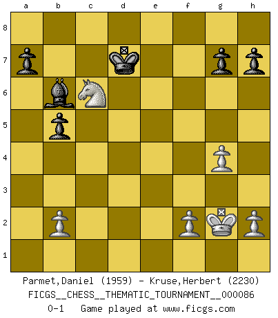 Last move : 0-1 2009 October 23 6:29:10 [Event "FICGS__CHESS__THEMATIC_TOURNAMENT__000086"] [Site "FICGS"] [Date "2009.07.16"] [Round "1"] [White "Parmet,Daniel"] [Black "Kruse,Herbert"] [Result "0-1"] [WhiteElo "1959"] [BlackElo "2230"] 1.e4 e5 2.Nf3 Nf6 3.Nxe5 d6 4.Nxf7 Kxf7 5.d4 c5 6.dxc5 Nc6 7.Bc4+ Be6 8.Bxe6+ Kxe6 9.O-O Kf7 10.Qd3 Qd7 11.Rd1 Qe6 12.cxd6 Nb4 13.Qb3 Qxb3 14.axb3 Nxc2 15.Ra4 b5 16.Ra6 Nxe4 17.Rc6 Nb4 18.Rc7+ Kg6 19.d7 Bd6 20.Rb7 Bc5 21.Be3 Rhd8 22.Nc3 Bxe3 23.Nxe4 Bb6 24.g4 Na6 25.Rd6+ Kf7 26.Ng5+ Kg8 27.b4 Nxb4 28.Kg2 Na6 29.Ne6 Kf7 30.Ng5+ Ke7 31.Re6+ Kf8 32.Rc6 Rab8 33.Rxb8 Nxb8 34.Ne6+ Ke7 35.Nxd8 Nxc6 36.Nxc6+ Kxd7 0-1 Petrov : Cochrane gambit Kingside Castling by player White (move 9) Player Black won this chess game. Follow this game move after move (download)There's never before been a Chess player with such a thorough knowledge of the intricacies of the game and such an absolutely indomitable will to win. I think Bobby is the greatest player that ever lived. (Lisa Lane) Die Neutralität betrachte ich als eine schwere Krankheit. (Viktor Kortschnoi) La partida mas dura de ganar es una partida ganada. (Emanuel Lasker) Il n'y a plus de joueurs du niveau de Jacob Murray dont la seule quête est le beau jeu, le plaisir de voir les pièces construire quelque chose. Sur 10 idées à la minute, 9 seront sans intérêt, la dernière s'avèrera géniale. (Christian Bauer) He who defends everything defends nothing. (Frederick the Great)