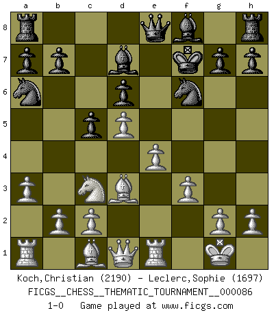 Last move : 1-0 2009 October 3 20:51:26 [Event "FICGS__CHESS__THEMATIC_TOURNAMENT__000086"] [Site "FICGS"] [Date "2009.07.16"] [Round "1"] [White "Koch,Christian"] [Black "Leclerc,Sophie"] [Result "1-0"] [WhiteElo "2190"] [BlackElo "1697"] 1.e4 e5 2.Nf3 Nf6 3.Nxe5 d6 4.Nxf7 Kxf7 5.d4 Qe8 6.Nc3 c6 7.Bd3 Na6 8.a3 Bg4 9.f3 Be6 10.O-O c5 11.d5 Bd7 12.Re1 1-0 Petrov : Cochrane gambit Kingside Castling by player White (move 10) Player White won this chess game. Follow this game move after move (download)Chess is in its essence a game, in its form an art, and in its execution a science. (Baron Tassilo) Fallen sollten polizeilich verboten werden. (Savielly Grigorievitsch Tartakower) Mi estilo es algo parecido entre un poco de Tal y Petrosian. (Reshevsky) La vérité est comme le meilleur coup aux échecs : elle existe, mais il faut la chercher. (Arturo Perez-Reverte) The ultimate in disposing one's troops is to be without ascertainable shape. Then the most penetrating spies cannot pry in nor can the wise lay plans against you. (Sun Tzu)