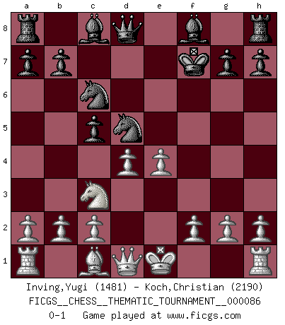Last move : 0-1 2009 August 10 6:30:35 [Event "FICGS__CHESS__THEMATIC_TOURNAMENT__000086"] [Site "FICGS"] [Date "2009.07.16"] [Round "1"] [White "Inving,Yugi"] [Black "Koch,Christian"] [Result "0-1"] [WhiteElo "1481"] [BlackElo "2190"] 1.e4 e5 2.Nf3 Nf6 3.Nxe5 d6 4.Nxf7 Kxf7 5.d4 c5 6.Nc3 Nc6 7.Bc4+ d5 8.Bxd5+ Nxd5 0-1 Petrov : Cochrane gambit Player Black won this chess game. Follow this game move after move (download)When the Chess game is over, the Pawn and the King go back to the same box. (Irish saying) Je mehr wir mit Computern analysieren, desto mehr glauben wir an Verteidigung. (Vladimir Kramnik) El muchacho (en ese entonces un niño de 12 años llamado Anatoly Karpov) no tiene ni idea de lo que es el Ajedrez y no hay futuro en absoluto para el en esta profesión. (Mikhail Botvinnik) Plusieurs personnes se sont demandées comment Tal faisait pour gagner... En fait, c'est très simple ! Il met ses pièces au centre de l'échiquier et les sacrifie quelque part ! (David Bronstein) If computers get too powerful, we can organize them into committees. That'll do them in. (Anonymous)