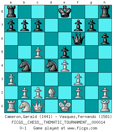 Last move : 0-1 2006 December 23 1:50:50 [Event "FICGS__CHESS__THEMATIC_TOURNAMENT__000014"] [Site "FICGS"] [Date "2006.09.20"] [Round "1"] [White "Cameron,Gerald"] [Black "Vasquez,Fernando"] [Result "0-1"] [WhiteElo "1441"] [BlackElo "1581"] 1.e4 e5 2.Nf3 Nc6 3.Bc4 Nf6 4.Ng5 Bc5 5.d4 d5 6.Bxd5 Nxd5 7.dxc5 Ndb4 8.Bd2 Bg4 9.Qc1 h6 10.Nf3 Bxf3 11.gxf3 Qf6 12.a3 Nd4 0-1 This chess game has been lost on time (started : 2006.09.20 2:18:34) Comment by player 1 : Gerald Cameron : We meet again :) Two knights defense : Wilkes Barre (Traxler) variation Player Black won this chess game. Follow this game move after move (download)In complicated positions, Bobby Fischer hardly had to be afraid of anybody. (Paul Keres) Je mehr ich von der FIDE weiss, um so weniger verstehe ich. (Alexander Kalifman) El Ajedrez expande y enriquece tu mente. (Saudin Robovic) Aux échecs, les retours au sommet sont rares : les dommages psychologiques consécutifs à une défaite sont trop sévères. (Daily Telegraph) Life is verb, not a noun. (Charlotte Perkins Gilman)