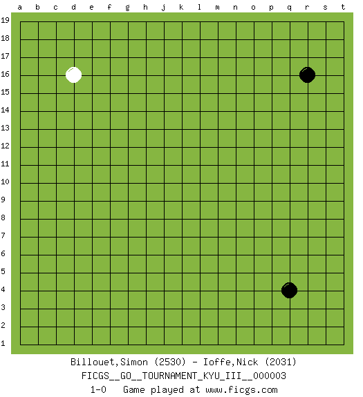 Last move : 1-0 2009 August 28 9:34:45 [Event "FICGS__GO__TOURNAMENT_KYU_III__000003"] [Site "FICGS"] [Date "2009.07.17"] [Round "1"] [Black "Billouet,Simon"] [White "Ioffe,Nick"] [Result "1-0"] [Rating 1 "2530"] [Rating 2 "2031"] 1.r16 d16 2.q4 1-0 This go game has been lost on time (started : 2009.07.17 1:3:54) Here are the names of the openings (joseki) played in the four corners : Corner q4 : q4 1-0 Hoshi (Hwajeom, Seongjeom, Xingwei`) 4-4 Point. The star or hoshi (4-4) point, emphasizing influence at the potential expense of territory. Player Black won this Go (weiqi, baduk) game. Follow this game move after move (download)Don't count territory held by only one eye. (Anonymous) He who is a good ruler must first have been ruled. (Aristotle)
