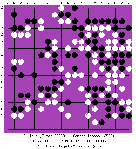 Last move : 0-1 2010 January 31 11:3:36 [Event "FICGS__GO__TOURNAMENT_KYU_III__000003"] [Site "FICGS"] [Date "2009.07.17"] [Round "1"] [Black "Billouet,Simon"] [White "Connor,Thomas"] [Result "0-1"] [Rating 1 "2530"] [Rating 2 "2586"] 1.r16 d16 2.q4 d4 3.p17 r6 4.r9 o4 5.q6 r3 6.q3 q7 7.r5 p6 8.q5 s7 9.p7 q8 10.o7 s5 11.s4 q9 12.o5 k3 13.q10 p10 14.q11 o9 15.c6 f4 16.b4 c3 17.c9 s16 18.s15 f17 19.c16 c15 20.d17 d15 21.e17 f16 22.b16 b15 23.b18 c11 24.e9 r15 25.q15 r14 26.s14 r13 27.s11 q16 28.r17 s13 29.s17 p15 30.p12 q14 31.n12 n15 32.n17 m9 33.l12 k17 34.l16 l14 35.l17 k13 36.k18 k9 37.l10 l9 38.k12 h13 39.h12 g12 40.h11 o2 41.p2 n3 42.k5 j4 43.b10 b11 44.g13 h14 45.f12 t4 46.t3 t5 47.s3 n6 48.o6 n5 49.n7 m7 50.h8 j7 51.h7 h6 52.g6 h5 53.j8 k8 54.e5 b3 55.c4 d5 56.d6 j17 57.j18 h18 58.g14 j10 59.h10 f6 60.f7 g5 61.g7 j19 62.l19 o12 63.o13 o11 64.p13 p16 65.q17 n13 66.n14 m13 67.o15 o16 68.o14 n16 69.m15 m14 70.o17 s9 71.s10 r8 72.s12 t14 73.t16 q12 74.r12 q13 75.p11 r10 76.t12 t13 77.m16 t10 78.r11 r9 0-1 Here are the names of the openings (joseki) played in the four corners : Corner q4 : q4 r6 Hoshi (Hwajeom, Seongjeom, Xingwei`) 4-4 Point. The star or hoshi (4-4) point, emphasizing influence at the potential expense of territory. Ikken Kakari (Hankan Keolch'im, Yi Gua`jiao~, 1-Space Low Approach). White 2 is the standard approach move to the 4-4. Corner d4 : d4 c6 Hoshi (Hwajeom, Seongjeom, Xingwei`) 4-4 Point. The star or hoshi (4-4) point, emphasizing influence at the potential expense of territory. Ikken Kakari (Hankan Keolch'im, Yi Gua`jiao~, 1-Space Low Approach). Black 2 is the standard approach move to the 4-4. Player White won this Go (weiqi, baduk) game. Follow this game move after move (download)The monkey jump is worth eight points. (Anonymous) Creativity is allowing yourself to make mistakes. Art is knowing which ones to keep. (Scott Adams)
