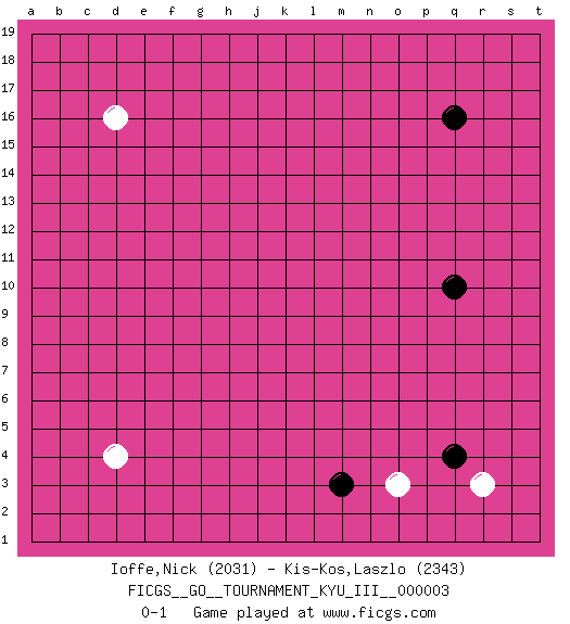 Last move : 0-1 2009 August 24 9:20:32 [Event "FICGS__GO__TOURNAMENT_KYU_III__000003"] [Site "FICGS"] [Date "2009.07.17"] [Round "1"] [Black "Ioffe,Nick"] [White "Kis-Kos,Laszlo"] [Result "0-1"] [Rating 1 "2031"] [Rating 2 "2343"] 1.q16 d4 2.q4 d16 3.q10 o3 4.m3 r3 0-1 This go game has been lost on time (started : 2009.07.17 1:3:54) Here are the names of the openings (joseki) played in the four corners : Corner q4 : q4 o3 Hoshi (Hwajeom, Seongjeom, Xingwei`) 4-4 Point. The star or hoshi (4-4) point, emphasizing influence at the potential expense of territory. Ikken Kakari (Hankan Keolch'im, Yi Gua`jiao~, 1-Space Low Approach). White 2 is the standard approach move to the 4-4. Player White won this Go (weiqi, baduk) game. Follow this game move after move (download)Learn the eye-stealing tesuji. (Anonymous) There is far too much law for those who can afford it and far too little for those who cannot. (Derek Bok)