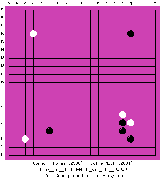 Last move : 1-0 2009 August 25 21:25:53 [Event "FICGS__GO__TOURNAMENT_KYU_III__000003 "] [Site "FICGS"] [Date "2009.07.17"] [Round "1"] [Black "Connor,Thomas "] [White "Ioffe,Nick "] [Result "1-0"] [Rating 1 "2586"] [Rating 2 "2031"] 1.q16 d16 2.q3 c3 3.f4 q5 4.p5 p6 5.p4 1-0 This go game has been lost on time (started : 2009.07.17 1:3:54) Here are the names of the openings (joseki) played in the four corners : Corner d4 : c3 f4San-San (Sam-Sam, San-San) 3-3 Point. The San-San (3-3) point, emphasizing territory at the expense of influence.Nikken Takagakari (Dukan Nop'dakeolch'im, E`r Gaogua`jiao~, 2-Space High Approach). White may continue with 4-5 or 4-6. White 4-6 works well when White is in the lower right (so an extension in the middle works both ways). The more conservative 4-5 is makes a slightly tighter shape (better for a fight). Corner q4 : q3 q5Komoku (Somok, Xiao~mu`) 3-4 Point. The komoku (3-4) point is the traditional corner enclosure move..Ikken Takagakari (Hankan Nop'dakeolch'im, Yi Gaogua`jiao~, 1-Space High Approach). The 5-4 approach move has become more popular in modern times, as modern Go emphasizes speed and influence. Player Black won this Go (weiqi, baduk) game.Follow this game move after move (download ) Connect with good shape. (Anonymous) Life is pleasant. Death is peaceful. It's the transition that's troublesome. (Isaac Asimov)