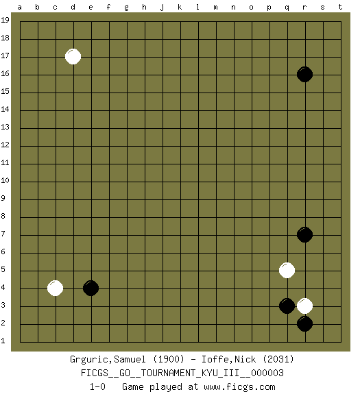 Last move : 1-0 2009 August 28 9:34:45 [Event "FICGS__GO__TOURNAMENT_KYU_III__000003 "] [Site "FICGS"] [Date "2009.07.17"] [Round "1"] [Black "Grguric,Samuel "] [White "Ioffe,Nick "] [Result "1-0"] [Rating 1 "1900"] [Rating 2 "2031"] 1.r16 d17 2.q3 c4 3.e4 q5 4.r7 r3 5.r2 1-0 This go game has been lost on time (started : 2009.07.17 1:3:54) Here are the names of the openings (joseki) played in the four corners : Corner d4 : c4 e4Komoku (Somok, Xiao~mu`) 3-4 Point. The komoku (3-4) point is the traditional corner enclosure move..Ikken Takagakari (Hankan Nop'dakeolch'im, Yi Gaogua`jiao~, 1-Space High Approach). The 5-4 approach move has become more popular in modern times, as modern Go emphasizes speed and influence. Corner q4 : q3 q5Komoku (Somok, Xiao~mu`) 3-4 Point. The komoku (3-4) point is the traditional corner enclosure move..Ikken Takagakari (Hankan Nop'dakeolch'im, Yi Gaogua`jiao~, 1-Space High Approach). The 5-4 approach move has become more popular in modern times, as modern Go emphasizes speed and influence. Player Black won this Go (weiqi, baduk) game.Follow this game move after move (download ) If you have lost four corners, resign. (Anonymous) A specialist learns more and more about less and less until he knows everything about nothing. (Nicholas Murray Butler)