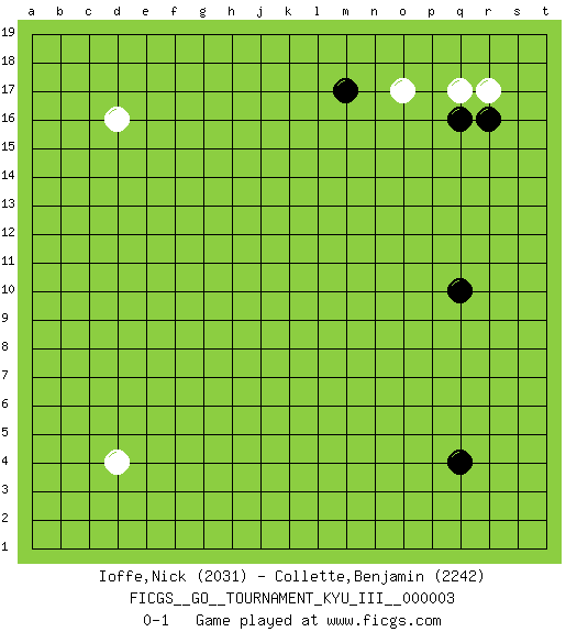 Last move : 0-1 2009 August 23 21:20:13 [Event "FICGS__GO__TOURNAMENT_KYU_III__000003"] [Site "FICGS"] [Date "2009.07.17"] [Round "1"] [Black "Ioffe,Nick"] [White "Collette,Benjamin"] [Result "0-1"] [Rating 1 "2031"] [Rating 2 "2242"] 1.q16 d4 2.q4 d16 3.q10 o17 4.m17 r17 5.r16 q17 0-1 This go game has been lost on time (started : 2009.07.17 1:3:54) Here are the names of the openings (joseki) played in the four corners : Corner q16 : q16 o17 Hoshi (Hwajeom, Seongjeom, Xingwei`) 4-4 Point. The star or hoshi (4-4) point, emphasizing influence at the potential expense of territory. Ikken Kakari (Hankan Keolch'im, Yi Gua`jiao~, 1-Space Low Approach). White 2 is the standard approach move to the 4-4. Player White won this Go (weiqi, baduk) game. Follow this game move after move (download)Use a wall to attack, not to make territory. (Anonymous) For a mechanic, you seem to do an excessive amount of thinking. (C-3PO in Star Wars ep.2)