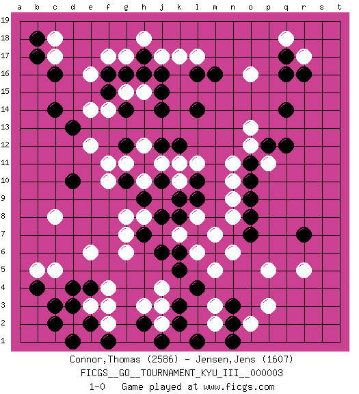 Last move : 1-0 2010 March 3 21:34:31 [Event "FICGS__GO__TOURNAMENT_KYU_III__000003"] [Site "FICGS"] [Date "2009.07.17"] [Round "1"] [Black "Connor,Thomas"] [White "Jensen,Jens"] [Result "1-0"] [Rating 1 "2586"] [Rating 2 "1607"] 1.q16 r5 2.c16 e3 3.d10 e16 4.h16 e14 5.c14 e12 6.d13 f10 7.l16 o16 8.q14 o13 9.q12 p11 10.p12 o12 11.o11 n11 12.o10 n10 13.o9 n9 14.o8 n8 15.o7 n6 16.k3 h3 17.n3 p5 18.r7 c8 19.c3 c5 20.e4 f4 21.d4 e6 22.e2 f2 23.d3 f3 24.b4 g15 25.j14 h15 26.j15 j17 27.h17 h18 28.j16 k17 29.l14 g17 30.g16 f17 31.f15 p3 32.k5 d2 33.c2 f14 34.g14 h12 35.k12 k10 36.f16 r17 37.q17 q18 38.r16 c17 39.b17 c18 40.b18 l17 41.m16 b5 42.d1 m5 43.l4 g6 44.j6 o2 45.n2 j2 46.k2 k1 47.l1 j4 48.j1 k7 49.h7 g7 50.h9 h8 51.j8 g8 52.l7 l6 53.k6 l8 54.k9 h10 55.j10 j11 56.l10 j9 57.h2 j3 58.j10 k11 59.l9 m7 60.k8 l11 61.g10 j9 62.n1 m2 63.j10 m3 64.h11 g11 65.g12 f11 66.j12 h10 67.f1 1-0 This go game has been lost on time (started : 2009.07.17 1:3:54) Here are the names of the openings (joseki) played in the four corners : Corner d16 : c16 e16 Komoku (Somok, Xiao~mu`) 3-4 Point. The komoku (3-4) point is the traditional corner enclosure move.. Ikken Takagakari (Hankan Nop'dakeolch'im, Yi Gaogua`jiao~, 1-Space High Approach). The 5-4 approach move has become more popular in modern times, as modern Go emphasizes speed and influence. Corner q4 : r5 o9 Mokuhazushi (Waemok, Wai`mu`) 5-3 Point. The mokuhazushi (5-3) point was popular in the Edo period in Japan (1600 - 1867). It emphasizes influence; territorially, it is inferior to the 3-4 point. Player Black won this Go (weiqi, baduk) game. Follow this game move after move (download)If White takes all four corners, Black should resign; if Black takes all four corners, Black should also resign. (David Kent) The best teachers teach from the heart, not from the book. (Author unknown)