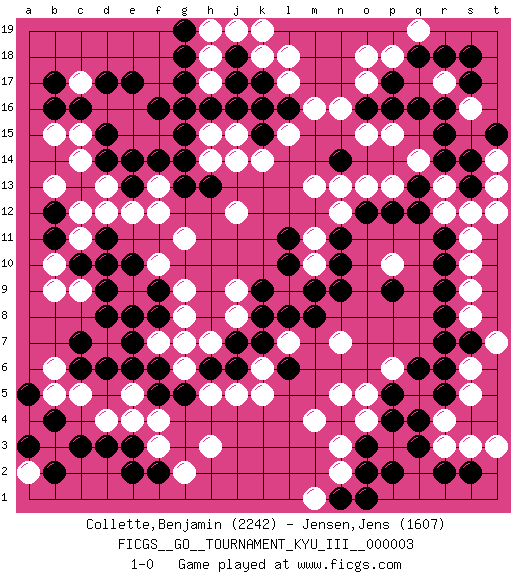 Last move : 1-0 2010 March 2 9:34:59 [Event "FICGS__GO__TOURNAMENT_KYU_III__000003"] [Site "FICGS"] [Date "2009.07.17"] [Round "1"] [Black "Collette,Benjamin"] [White "Jensen,Jens"] [Result "1-0"] [Rating 1 "2242"] [Rating 2 "1607"] 1.q16 q5 2.c16 d4 3.c6 c5 4.d6 f4 5.d10 e16 6.e17 d16 7.d17 c15 8.f16 f15 9.g16 h14 10.d15 e15 11.d14 c17 12.b16 c14 13.c13 d13 14.e14 b13 15.e13 b15 16.b17 c12 17.g14 e12 18.g13 f10 19.d11 d12 20.b11 f7 21.d8 c11 22.c10 j15 23.h16 h15 24.g15 j12 25.q3 o4 26.o3 n3 27.n4 p3 28.o2 o5 29.p2 m4 30.b12 g11 31.f8 g8 32.f9 q14 33.r14 r13 34.r15 p15 35.q13 p13 36.q12 r12 37.p12 o13 38.r11 s11 39.r10 s10 40.s14 t13 41.s13 s12 42.r9 s9 43.r8 s8 44.r7 s6 45.r6 s5 46.s7 t7 47.r5 r4 48.q4 r3 49.p4 p6 50.r2 s3 51.o12 n12 52.n11 m11 53.n10 p10 54.p9 m10 55.n9 o17 56.q18 n7 57.p5 n5 58.q6 g9 59.m9 l9 60.p16 m13 61.m8 l7 62.f6 g6 63.e7 l17 64.g7 h7 65.g5 f7 66.h6 g7 67.f5 h3 68.c3 b5 69.e3 e4 70.f2 b3 71.b2 f3 72.d3 g2 73.e2 e9 74.e10 f12 75.e8 n2 76.o16 n16 77.n14 n13 78.l8 o15 79.k9 j5 80.j6 h5 81.k7 k6 82.j7 j8 83.k8 p18 84.p17 o18 85.s2 t3 86.l11 j9 87.l10 a2 88.b4 a4 89.a3 b9 90.a5 b10 91.j17 b6 92.c7 c9 93.d9 k18 94.k16 q19 95.r18 r17 96.s17 s16 97.s18 t14 98.t15 t12 99.r16 h18 100.j18 j19 101.g18 h17 102.g17 h19 103.g19 k19 104.k17 l18 105.k15 k14 106.h13 j14 107.j16 l15 108.l16 m16 109.l6 e5 110.e6 k5 111.n1 m1 112.o1 f13 113.f14 1-0 This go game has been lost on time (started : 2009.07.17 1:3:54) Here are the names of the openings (joseki) played in the four corners : Corner d4 : d4 c6 Hoshi (Hwajeom, Seongjeom, Xingwei`) 4-4 Point. The star or hoshi (4-4) point, emphasizing influence at the potential expense of territory. Ikken Kakari (Hankan Keolch'im, Yi Gua`jiao~, 1-Space Low Approach). Black 2 is the standard approach move to the 4-4. Corner d16 : c16 e16 Komoku (Somok, Xiao~mu`) 3-4 Point. The komoku (3-4) point is the traditional corner enclosure move.. Ikken Takagakari (Hankan Nop'dakeolch'im, Yi Gaogua`jiao~, 1-Space High Approach). The 5-4 approach move has become more popular in modern times, as modern Go emphasizes speed and influence. Corner q4 : q5 q3 Takamoku (Gomok, Gaomu`) 5-4 Point. The takamoku (high) point (5-4). With its emphasis on influence, the 5-4 point complements the 4-4 (hoshi) point in creating an influence-oriented fuseki. Komoku. White responds with 3-3, 3-5, 4-6, 4-7, 3-6, 3-7. Corner q16 : q16 q14 Hoshi (Hwajeom, Seongjeom, Xingwei`) 4-4 Point. The star or hoshi (4-4) point, emphasizing influence at the potential expense of territory. Ikken Takagakari (Hankan Nop'dakeolch'im, Yi Gaojia, 1-Space High Approach). Black typically responds at 6-4 or 3-10. Black 4-10 is played when Black finds play on the right side advantageous. Black 4-8 or 3-8 may be played when Black has support at top. Player Black won this Go (weiqi, baduk) game. Follow this game move after move (download)The strong player plays straight, the weak diagonally. (Anonymous) In my experience, there's no such thing as luck. (Obi-Wan Kenobi in Star Wars ep.4)