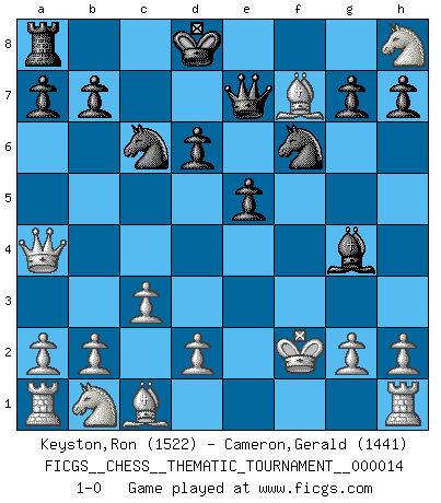Last move : 1-0 2006 December 17 6:44:6 [Event "FICGS__CHESS__THEMATIC_TOURNAMENT__000014"] [Site "FICGS"] [Date "2006.09.20"] [Round "1"] [White "Keyston,Ron"] [Black "Cameron,Gerald"] [Result "1-0"] [WhiteElo "1522"] [BlackElo "1441"] 1.e4 e5 2.Nf3 Nc6 3.Bc4 Nf6 4.Ng5 Bc5 5.Nxf7 Bxf2+ 6.Kf1 Qe7 7.Nxh8 d5 8.exd5 Nd4 9.d6 cxd6 10.c3 Bg4 11.Qa4+ Nc6 12.Bf7+ Kd8 13.Kxf2 1-0 This chess game has been lost on time (started : 2006.09.20 2:18:34) Two knights defense : Wilkes Barre (Traxler) variation Player White won this chess game. Follow this game move after move (download)The Chess pieces are the block alphabet which shapes thoughts; and these thoughts, although making a visual design on the chessboard, express their beauty abstractly, like a poem. (Marcel Duchamp) Ich war zu klein für die Schach-Schülermannschaft! (Woody Allen) Cuando veas una buena jugada, trata de encontrar otra mejor. (Emanuel Lasker) La guerre est enfant de la passion, la passion est enfant du narcissisme et le narcissisme est l'enfant. (...) Une autre partie ? (Thibault de Vassal) True nature is revealed in times of difficulty. (Chinese proverb)
