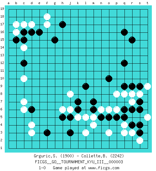 Last move : 1-0 2009 August 28 0:57:5 [Event "FICGS__GO__TOURNAMENT_KYU_III__000003"] [Site "FICGS"] [Date "2009.07.17"] [Round "1"] [Black "Grguric,Samuel"] [White "Collette,Benjamin"] [Result "1-0"] [Rating 1 "1900"] [Rating 2 "2242"] 1.q16 d4 2.d16 q4 3.r6 o3 4.s4 r3 5.r9 c14 6.c12 c17 7.c16 d17 8.e16 b16 9.b15 b17 10.c15 f17 11.g15 c7 12.j3 l3 13.f3 d3 14.h17 f18 15.r15 c10 16.d6 c6 17.q12 k5 18.j5 j6 19.h5 h6 20.k6 l5 21.k7 j8 22.l9 q8 23.q9 p8 24.o10 r8 25.s3 s2 26.r4 q3 27.q5 p6 28.p5 o6 29.o5 n6 30.n5 m4 31.m6 m5 32.s7 s8 33.s9 t9 34.m7 r7 35.s6 t5 36.q6 1-0 Here are the names of the openings (joseki) played in the four corners : Corner q4 : q4 r6 Hoshi (Hwajeom, Seongjeom, Xingwei`) 4-4 Point. The star or hoshi (4-4) point, emphasizing influence at the potential expense of territory. Ikken Kakari (Hankan Keolch'im, Yi Gua`jiao~, 1-Space Low Approach). Black 2 is the standard approach move to the 4-4. Corner d16 : d16 c14 Hoshi (Hwajeom, Seongjeom, Xingwei`) 4-4 Point. The star or hoshi (4-4) point, emphasizing influence at the potential expense of territory. Ikken Kakari (Hankan Keolch'im, Yi Gua`jiao~, 1-Space Low Approach). White 2 is the standard approach move to the 4-4. Player Black won this Go (weiqi, baduk) game. Follow this game move after move (download)At the head of two stones in a row, play hane. (Anonymous) Men never do evil so completely and cheerfully as when they do it from religious conviction. (Blaise Pascal)
