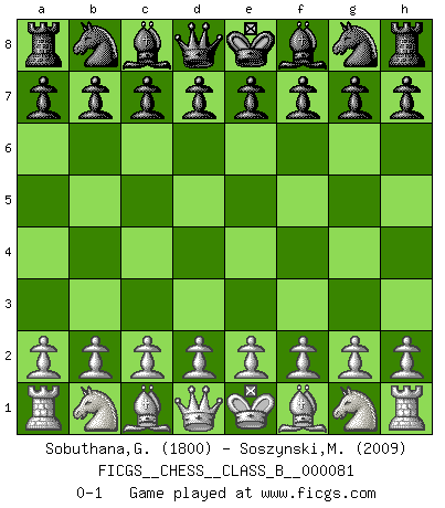 Last move : 0-1 2009 August 28 9:34:45 [Event "FICGS__CHESS__CLASS_B__000081"] [Site "FICGS"] [Date "2009.07.18"] [Round "1"] [White "Sobuthana,Gugulethu"] [Black "Soszynski,Marek"] [Result "0-1"] [WhiteElo "1800"] [BlackElo "2009"] 0-1 This chess game has been lost on time (started : 2009.07.18 9:58:1) Player Black won this chess game. Follow this game move after move (download)Becoming successful at Chess allows you to discover your own personality. That's what I want for the kids I teach. (Saudin Robovic) Ein Isolani verdüstert die Stimmung auf dem ganzen Schachbrett. (Savielly Grigorievitsch Tartakower) Nada excita más a Grandes Maestros aburridos que una novedad teórica. (Dominic Lawson) Ce qui est bien, c'est d'avoir tout un tas de pièces en prise : l'adversaire ne peut en prendre qu'une à la fois. Cité par Thierry Audin. The question of whether computers can think is just like question of whether submarines can swim. (Edsger W. Dijkstra)