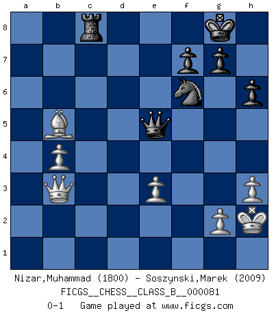 Last move : 0-1 2009 November 3 4:47:39 [Event "FICGS__CHESS__CLASS_B__000081"] [Site "FICGS"] [Date "2009.07.18"] [Round "1"] [White "Nizar,Muhammad"] [Black "Soszynski,Marek"] [Result "0-1"] [WhiteElo "1800"] [BlackElo "2009"] 1.d4 d5 2.c4 e6 3.Nf3 Nf6 4.Nc3 c6 5.e3 Nbd7 6.Qc2 Bd6 7.Bd3 dxc4 8.Bxc4 O-O 9.O-O b5 10.Bd3 Bb7 11.Rd1 Qc7 12.Bd2 a6 13.b4 a5 14.a3 h6 15.h3 Rfd8 16.Rdc1 Qb8 17.Qb3 axb4 18.axb4 Rxa1 19.Rxa1 e5 20.Bg6 Rf8 21.Bc2 Re8 22.Be1 exd4 23.Nxd4 Bh2+ 24.Kh1 Be5 25.Bd2 Bxd4 26.exd4 Qd6 27.Bg6 Nd5 28.Bh5 N7f6 29.Bf3 Nb6 30.Nxb5 cxb5 31.Bxb7 Qxd4 32.Be3 Qxa1+ 33.Kh2 Nc4 34.Bc6 Nxe3 35.fxe3 Rc8 36.Bxb5 Qe5+ 0-1 Queen's gambit declined Kingside Castling by player Black (move 8) Kingside Castling by player White (move 9) Player Black won this chess game. Follow this game move after move (download)Openings teach you openings. Endgames teach you chess ! (Stephan Gerzadowicz) Der zweitbeste Zug ist oft der einzig richtige. (Savielly Grigorievitsch Tartakower) El Ajedrez te enseña a controlarl la excitación inicial que sientes cuando vez algo que parece bueno y te enseña a pensar objetivamente cuando te encuentras en problemas. (Stanley Kubrick) Karpov est une pièce de musée. (Garry Kasparov) I feel so... helpless. (C-3PO in Star Wars ep.3)