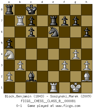 Last move : 0-1 2009 September 5 9:9:43 [Event "FICGS__CHESS__CLASS_B__000081"] [Site "FICGS"] [Date "2009.07.18"] [Round "1"] [White "Block,Benjamin"] [Black "Soszynski,Marek"] [Result "0-1"] [WhiteElo "1843"] [BlackElo "2009"] 1.e4 e5 2.Nf3 Nc6 3.Bb5 Nf6 4.O-O Nxe4 5.d4 Nd6 6.Bxc6 dxc6 7.dxe5 Nf5 8.Qxd8+ Kxd8 9.Nc3 Ne7 10.h3 h6 11.Rd1+ Ke8 12.Bf4 Ng6 13.Bh2 Bb4 14.Nd4 Bc5 15.b3 Nf8 16.Rd3 Bxd4 17.Rxd4 Bf5 18.Rb4 a5 19.Rxb7 Kd8 20.e6 Nxe6 21.Re1 Re8 22.g4 Bxc2 23.Na4 Re7 24.f3 Kc8 0-1 Ruy Lopez : Berlin defense, Open variation Kingside Castling by player White (move 4) Player Black won this chess game. Follow this game move after move (download)Not all artists are Chess players, but all Chess players are artists. (Marcel Duchamp) Ich rechne überhaupt nicht voraus. Ich gewinne auch so. (Robert James Fischer) De todos mis libros Rusos, la defensa contiene y difunde el 'calor' mas grande que pudiese verse extraño al observar lo supremamente abstracto que el Ajedrez supuestamente es. (Vladimir Nabokov) Aucun coup ne doit être joué sans but. (Pedro Damiano) Some people are so afraid to die that they never begin to live. (Henry Van Dyke)