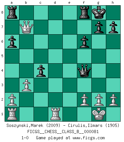 Last move : 1-0 2009 October 7 21:12:31 [Event "FICGS__CHESS__CLASS_B__000081"] [Site "FICGS"] [Date "2009.07.18"] [Round "1"] [White "Soszynski,Marek"] [Black "Cirulis,Ilmars"] [Result "1-0"] [WhiteElo "2009"] [BlackElo "1905"] 1.e4 c5 2.Nf3 Nc6 3.Bb5 e6 4.O-O Nge7 5.b3 a6 6.Bxc6 Nxc6 7.Bb2 b5 8.Na3 f6 9.c4 Be7 10.Qe2 bxc4 11.Nxc4 O-O 12.d4 cxd4 13.Nxd4 Bb7 14.Rfd1 Nxd4 15.Bxd4 d5 16.Be3 Qc7 17.exd5 exd5 18.Bf4 Qxf4 19.Qxe7 dxc4 20.Qxb7 1-0 This chess game has been lost on time (started : 2009.07.18 9:58:1) Sicilian : Nimzovich-Rossolimo attack (without ...d6) Kingside Castling by player White (move 4) Kingside Castling by player Black (move 11) Player White won this chess game. Follow this game move after move (download)Live, lose, and learn, by observing your opponent how to win. (Amber Steenbock) Ich würde die 30 stärksten Spieler der USA im Simultanspiel besiegen. (José Raúl Capablanca) Yo adoro todas la posiciones. Denme una partida posicional difícil, y la jugaré. Pero posiciones totalmente ganadas, no las tolero. (Hein Donner) Vous n'êtes pas toujours obligé de jouer le meilleur coup. Un coup doit être actif, entreprenant, correct et beau ! (David Bronstein) All men can see these tactics whereby I conquer, but what none can see is the strategy out of which victory is evolved. (Sun Tzu)