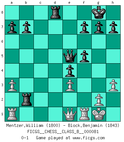 Last move : 0-1 2010 January 29 20:39:21 [Event "FICGS__CHESS__CLASS_B__000081"] [Site "FICGS"] [Date "2009.07.18"] [Round "1"] [White "Mentzer,William"] [Black "Block,Benjamin"] [Result "0-1"] [WhiteElo "1800"] [BlackElo "1843"] 1.d4 Nf6 2.Nf3 d5 3.e3 c5 4.c3 e6 5.Bd3 Nc6 6.Nbd2 Bd6 7.O-O O-O 8.e4 cxd4 9.cxd4 Nb4 10.Bb1 dxe4 11.Ne5 Qc7 12.Nb3 Bxe5 13.dxe5 Qxe5 14.Be3 Nc6 15.h3 Nd5 16.Qd2 Rd8 17.Qe2 Nxe3 18.fxe3 Bd7 19.a3 Ne7 20.Nd4 Nf5 21.Nxf5 exf5 22.Ba2 Bb5 23.Bc4 Bxc4 24.Qxc4 Rd2 25.Qb4 Rxb2 26.Qe1 Rd8 0-1 This chess game has been lost on time (started : 2009.07.18 9:58:1) Queen's pawn game Kingside Castling by player White (move 7) Kingside Castling by player Black (move 7) Player Black won this chess game. Follow this game move after move (download)Help your pieces so they can help you. (Paul Morphy) Je mehr ich von der FIDE weiss, um so weniger verstehe ich. (Alexander Kalifman) De eso se trata el Ajedrez. Un día le das una lección a tu oponente y al día siguiente el te da una a tí. (Bobby Fischer) Demandez au pauvre Cg1 ce qu'il en pense. Eduard Gufeld à propos de la variante Saemisch de l'Est-Indienne. Life is painting a picture, not doing a sum. (Oliver Wendell Holmes, Jr.)