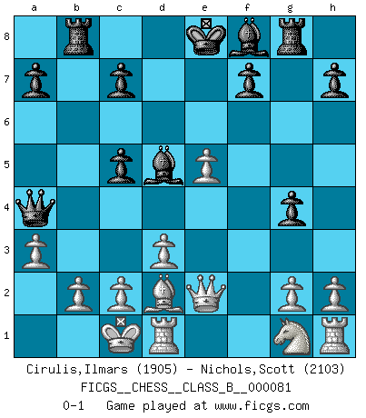 Last move : 0-1 2009 July 18 18:53:3 [Event "FICGS__CHESS__CLASS_B__000081"] [Site "FICGS"] [Date "2009.07.18"] [Round "1"] [White "Cirulis,Ilmars"] [Black "Nichols,Scott"] [Result "0-1"] [WhiteElo "1905"] [BlackElo "2103"] 1.e4 e5 2.Nc3 Nf6 3.f4 d5 4.fxe5 Nxe4 5.Nf3 g5 6.Qe2 Nc6 7.Nxe4 dxe4 8.Qxe4 g4 9.Ng1 Be6 10.Bb5 Qd7 11.Bxc6 bxc6 12.d3 Bd5 13.Qe2 Rg8 14.Bd2 c5 15.O-O-O Qa4 16.a3 Rb8 0-1 Vienna gambit Queenside Castling by player White (move 15) Player Black won this chess game. Follow this game move after move (download)The game of Chess is not merely an idle amusement; several very valuable qualities of the mind are to be acquired and strengthened by it, so as to become habits ready on all occasions; for life is a kind of Chess. (Benjamin Franklin) Dass jemand wie Surab Asmaiparaschwili, der selbst Elopunkte gekauft hat , Vize-Präsident der Fide werden konnte, sagt schon einges über den Zustand dieser Organisation aus. (Joel Lautier) Una de estas pequeñas movidas modestas pudieran ser mas molestas a tu oponente que la amenaza mas grande. (Siegbert Tarrasch) Le système Elo représente seulement une moyenne. Il est simplement un indicateur de votre stabilité. (Anatoli Karpov) If everyone is thinking alike, then somebody isn't thinking. (US General George S. Patton)