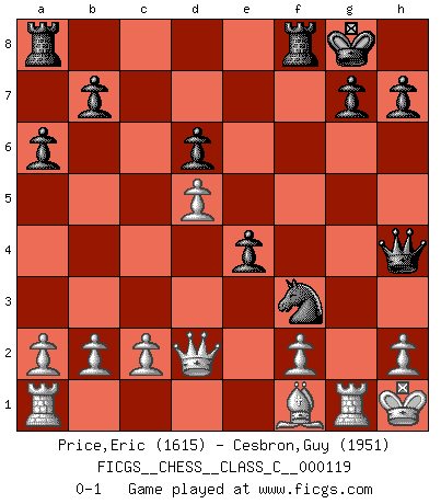 Last move : 0-1 2009 August 18 11:47:31 [Event "FICGS__CHESS__CLASS_C__000119"] [Site "FICGS"] [Date "2009.07.19"] [Round "1"] [White "Price,Eric"] [Black "Cesbron,Guy"] [Result "0-1"] [WhiteElo "1615"] [BlackElo "1951"] 1.e4 c5 2.Nf3 a6 3.d4 cxd4 4.Nxd4 Nf6 5.Nc3 e5 6.Nf3 Bb4 7.Bd2 O-O 8.Bd3 d6 9.O-O Bg4 10.Nd5 Bxd2 11.Qxd2 Nxd5 12.exd5 Bxf3 13.gxf3 Qf6 14.Be4 Nd7 15.Kg2 Qh4 16.Rg1 f5 17.Bd3 e4 18.fxe4 fxe4 19.Bf1 Ne5 20.Kh1 Nf3 0-1 Sicilian : O'Kelly variation Kingside Castling by player Black (move 7) Kingside Castling by player White (move 9) Player Black won this chess game. Follow this game move after move (download)Of Chess it has been said that life is not long enough for it, but that is the fault of life, not Chess. (William Ewart Napier) Ich verachte die Medien. (Robert James Fischer) El jugador de combinación piensa hacia adelante; comienza de la posición dada y trabaja las movidas contundentes en su mente. (Emanuel Lasker) Votre prénom est 'Tactique', votre deuxième prénom est 'Tactique' et votre nom est 'Tactique'. (Ken Smith) We're missing something. (Gregory House, House M.D.)