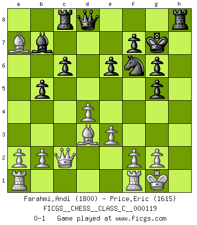 Last move : 0-1 2009 December 2 20:51:35 [Event "FICGS__CHESS__CLASS_C__000119"] [Site "FICGS"] [Date "2009.07.19"] [Round "1"] [White "Farahmi,Andi"] [Black "Price,Eric"] [Result "0-1"] [WhiteElo "1800"] [BlackElo "1615"] 1.d4 e6 2.c4 Nf6 3.Nc3 d5 4.Nf3 c6 5.e3 Nbd7 6.Qc2 Bd6 7.Bd3 O-O 8.O-O dxc4 9.Bxc4 b5 10.Bd3 Bb7 11.Bd2 Rc8 12.Ng5 h6 13.Nce4 Bxh2+ 14.Kxh2 hxg5 15.Kg1 Nxe4 16.Bxe4 Nf6 17.Bb4 Re8 18.Bd3 g6 19.Bc5 Kg7 20.Bxa7 Rh8 0-1 This chess game has been lost on time (started : 2009.07.19 8:36:59) Queen's pawn Kingside Castling by player Black (move 7) Kingside Castling by player White (move 8) Player Black won this chess game. Follow this game move after move (download)Only sissies Castle. (Rob Sillars) Die Neutralität betrachte ich als eine schwere Krankheit. (Viktor Kortschnoi) Diferente gente reacciona diferentemente en aceptar la derrota. (Bobby Fischer) Si le désir cupide (et stupide) de gagner est une inépuisable source de souffrance, une combinaison brillante sur l'échiquier est une découverte : le coquelicot qui s'épanouit lorsque apparaît la Voie Lactée. (Arrabal) The project of the man are lower than those of the sky. (Chinese proverb)