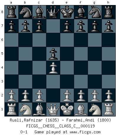 Last move : 0-1 2009 September 3 8:51:19 [Event "FICGS__CHESS__CLASS_C__000119"] [Site "FICGS"] [Date "2009.07.19"] [Round "1"] [White "Rusli,Rafnizar"] [Black "Farahmi,Andi"] [Result "0-1"] [WhiteElo "1635"] [BlackElo "1800"] 1.d4 d5 0-1 Queen's pawn game Player Black won this chess game. Follow this game move after move (download)A strong memory, concentration, imagination, and a strong will is required to become a great Chess player. (Bobby Fischer) Vielleicht wirkt die Aura früherer Spieler glanzvoller als die der heutigen Spieler, aber das liegt daran, dass man kein Programm wie Fritz hatte, das einem all die Löcher in ihren Partien zeigt. (Vladimir Kramnik) Después de una mala apertura, hay una esperanza en el juego medio. Pero una vez que estas en finales, el momento de la verdad ha llegado. (Edmar Mednis) La conception d'un plan est le processus par lequel un joueur exploite les avantages de sa position tout en s'efforçant d'en réduire au minimum les inconvénients. Afin de garantir le succès, un plan doit toujours se fonder sur un diagnostic objectif des particularités d'une position. La conception d'un plan est d'autant plus difficile que la position est équilibrée, et grandement facilitée lorsqu'il n'existe qu'un seul plan susceptible de répondre aux exigences de la position. (Harry Golombek) Hardware: the parts of a computer that can be kicked. (Jeff Persis)