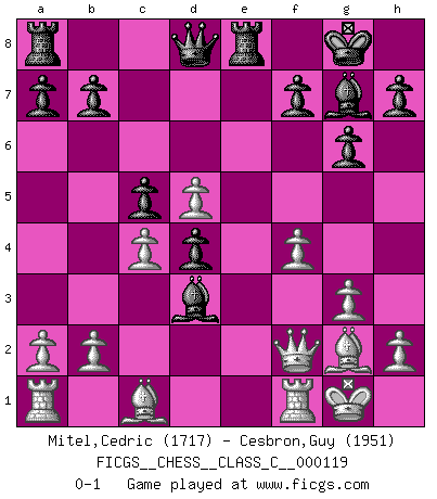 Last move : 0-1 2009 August 18 1:10:31 [Event "FICGS__CHESS__CLASS_C__000119"] [Site "FICGS"] [Date "2009.07.19"] [Round "1"] [White "Mitel,Cedric"] [Black "Cesbron,Guy"] [Result "0-1"] [WhiteElo "1717"] [BlackElo "1951"] 1.f4 d5 2.Nf3 Nf6 3.g3 g6 4.Bg2 Bg7 5.O-O O-O 6.d3 c5 7.Qe1 Nc6 8.e4 dxe4 9.dxe4 e5 10.Nc3 Nd4 11.Nxd4 exd4 12.Nd5 Nxd5 13.exd5 Re8 14.Qf2 Bf5 15.c4 Bd3 0-1 Bird's Opening Kingside Castling by player White (move 5) Kingside Castling by player Black (move 5) Player Black won this chess game. Follow this game move after move (download)Some sacrifices are sound; the rest are mine. (Mikhail Tal) Strategie ist, wie man ein Mädchen auf den Rücksitz bekommt. Taktik ist, was man tut, wenn man dann dort ist. (Anonymous) Una buena memoria, concentración, imaginación y una fuerte voluntad, se requiere para llegar a ser un buen jugador. (Bobby Fischer) RxDa4 pat (...) The man who strikes first admits that his ideas have given out. (Chinese proverb)