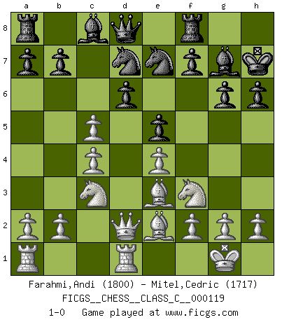 Last move : 1-0 2009 October 1 7:27:19 [Event "FICGS__CHESS__CLASS_C__000119"] [Site "FICGS"] [Date "2009.07.19"] [Round "1"] [White "Farahmi,Andi"] [Black "Mitel,Cedric"] [Result "1-0"] [WhiteElo "1800"] [BlackElo "1717"] 1.d4 g6 2.e4 Bg7 3.c4 d6 4.Nc3 Nd7 5.Be2 e5 6.Nf3 Ne7 7.O-O O-O 8.Be3 h6 9.Qd2 Kh7 10.Rfd1 c5 11.dxc5 1-0 Modern defense Kingside Castling by player White (move 7) Kingside Castling by player Black (move 7) Player White won this chess game. Follow this game move after move (download)Chess is the art of analysis. (Mikhail Botvinnik) Wir irren allesamt, nur jeder irrt anders. (Georg Christoph Lichtenberg) Después de la respuesta de las negras a 1.e4 con 1..e5, se quedan siempre tratando de entrar dentro del juego. (Howard Staunton) Pour se monter efficace, un Cavalier a besoin d'avant-postes ! Les Cavaliers font les meilleurs bloqueurs de pions passés. War is the child of passion, passion is the child of narcissism and narcissism is the child. (...) Another game ? (Thibault de Vassal)