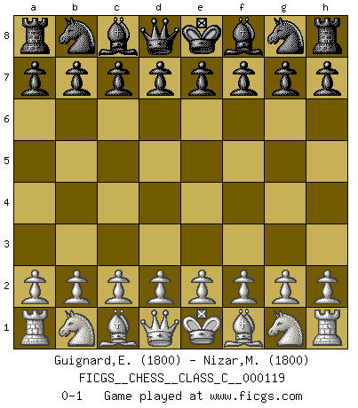 Last move : 0-1 2009 August 28 9:34:45 [Event "FICGS__CHESS__CLASS_C__000119"] [Site "FICGS"] [Date "2009.07.19"] [Round "1"] [White "Guignard,Emmanuel"] [Black "Nizar,Muhammad"] [Result "0-1"] [WhiteElo "1800"] [BlackElo "1800"] 0-1 This chess game has been lost on time (started : 2009.07.19 8:36:59) Player Black won this chess game. Follow this game move after move (download)The Pin is mightier than the sword. (Fred Reinfeld) Wer wird heute Abend ihr Gegner sein? -- Heute Abend spiele ich gegen die schwarzen Steine. (Akiba Rubinstein) Tu puedes aprender mucho mas de una partida que pierdas que de una partida ganada. Tendras que perder cientos de partidas antes de llegar a ser un buen jugador. (Jose Raul Capablanca) La vie et les Echecs sont tous les deux une lutte constante. (Lasker) Information on the Internet is subject to the same rules and regulations as conversation at a bar. (George Lundberg)